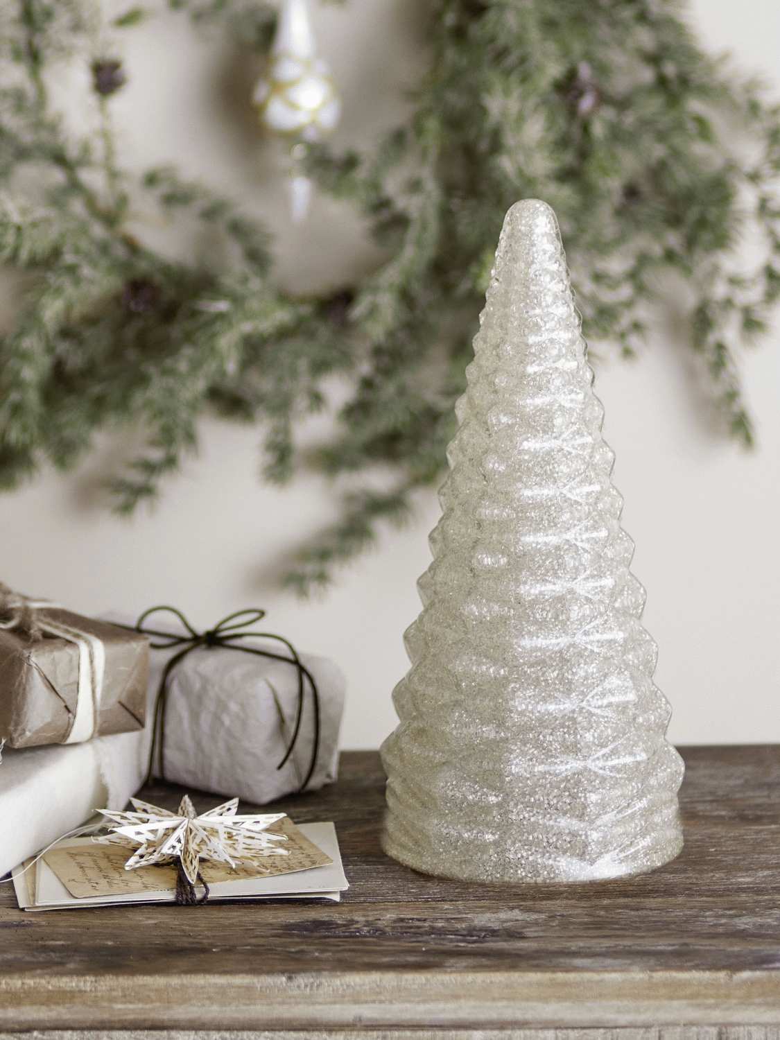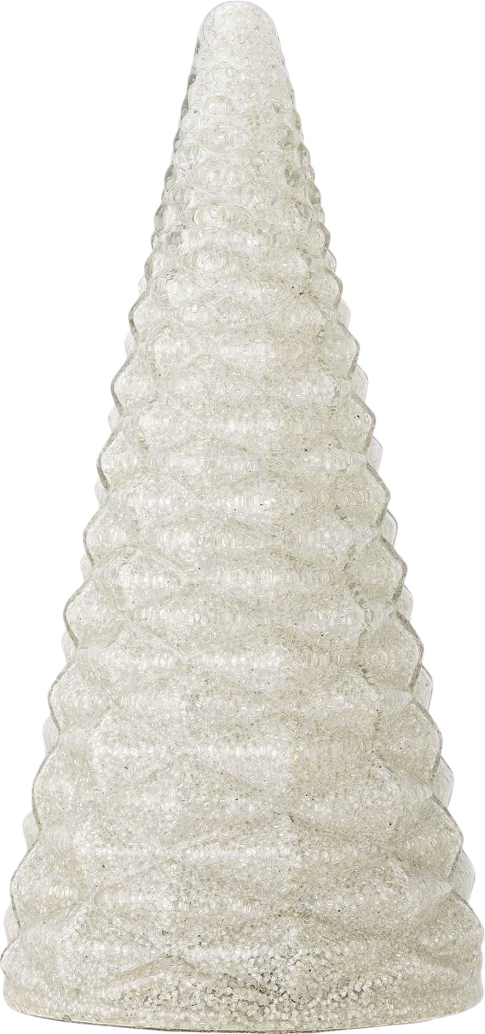 Die raffinierte Glasverarbeitung zeigt sich in jedem Detail: Das charakteristische geprägte Oberflächenmuster erzeugt eine faszinierende Textur, während die silberfarbene Veredelung dem Tannenbaum eine luxuriöse Ausstrahlung verleiht. Wenn Licht auf die Glasoberfläche trifft, entstehen magische Reflexionen, die eine warme und einladende Atmosphäre in deinen Räumen schaffen.