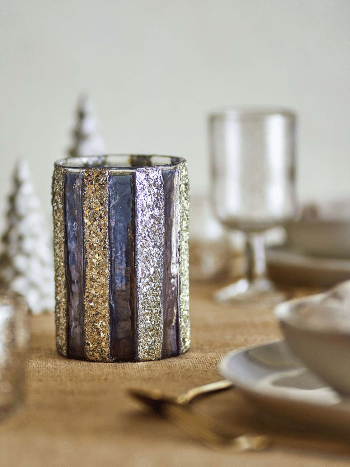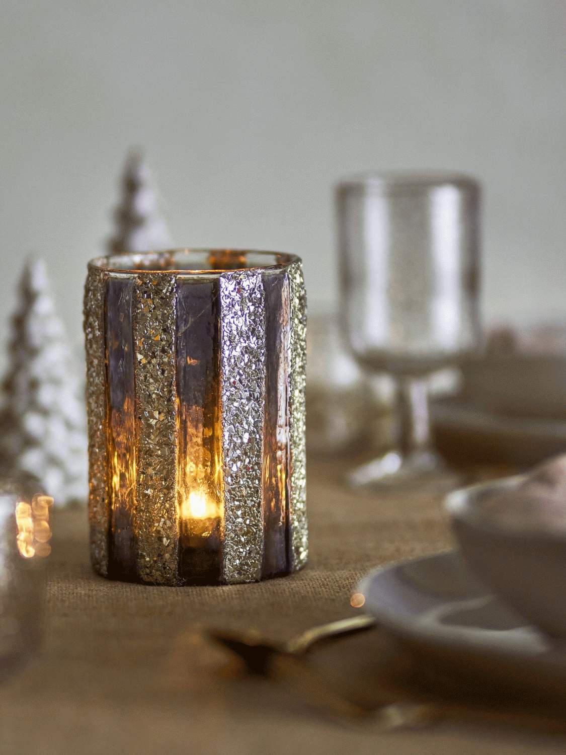Das charakteristische gestreifte Muster mit Glasglimmer fängt das Licht auf zauberhafte Weise ein und reflektiert es in warmen, einladenden Tönen. Wenn du ein Teelicht in den Halter stellst, tanzt das Licht durch die nuancierte Glasoberfläche und wirft wunderschöne Schattenmuster, die dein Zuhause in ein gemütliches Refugium verwandeln. Die goldene Finish verleiht jedem Raum einen Hauch von Luxus und harmoniert sowohl mit skandinavischen als auch internationalen Einrichtungsstilen.