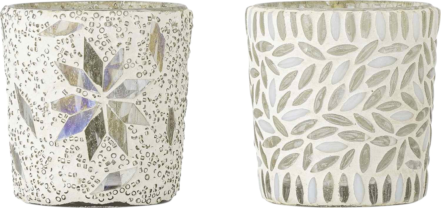Diese exquisiten Teelichthalter aus der Myr-Kollektion von Bloomingville verwandeln dein Zuhause in eine Oase der Gemütlichkeit durch ihren raffinierten Mosaikeffekt im charakteristischen Glasdesign. Die eleganten weißen und silberfarbenen Nuancen schaffen eine harmonische Verbindung zwischen skandinavischer Schlichtheit und sophistizierter Ästhetik.Das Set besteht aus zwei identischen Teelichthaltern, die jeweils eine Höhe von 7,5 cm und einen Durchmesser von 6,5 cm aufweisen. Diese perfekten Proportionen machen sie zu idealen Begleitern für deinen Esstisch, die Fensterbank oder als Teil einer größeren Dekoration. Das hochwertige Glasmaterial wurde sorgfältig mit einem Mosaikeffekt bearbeitet, der das Licht der Teelichter auf bezaubernde Weise reflektiert.