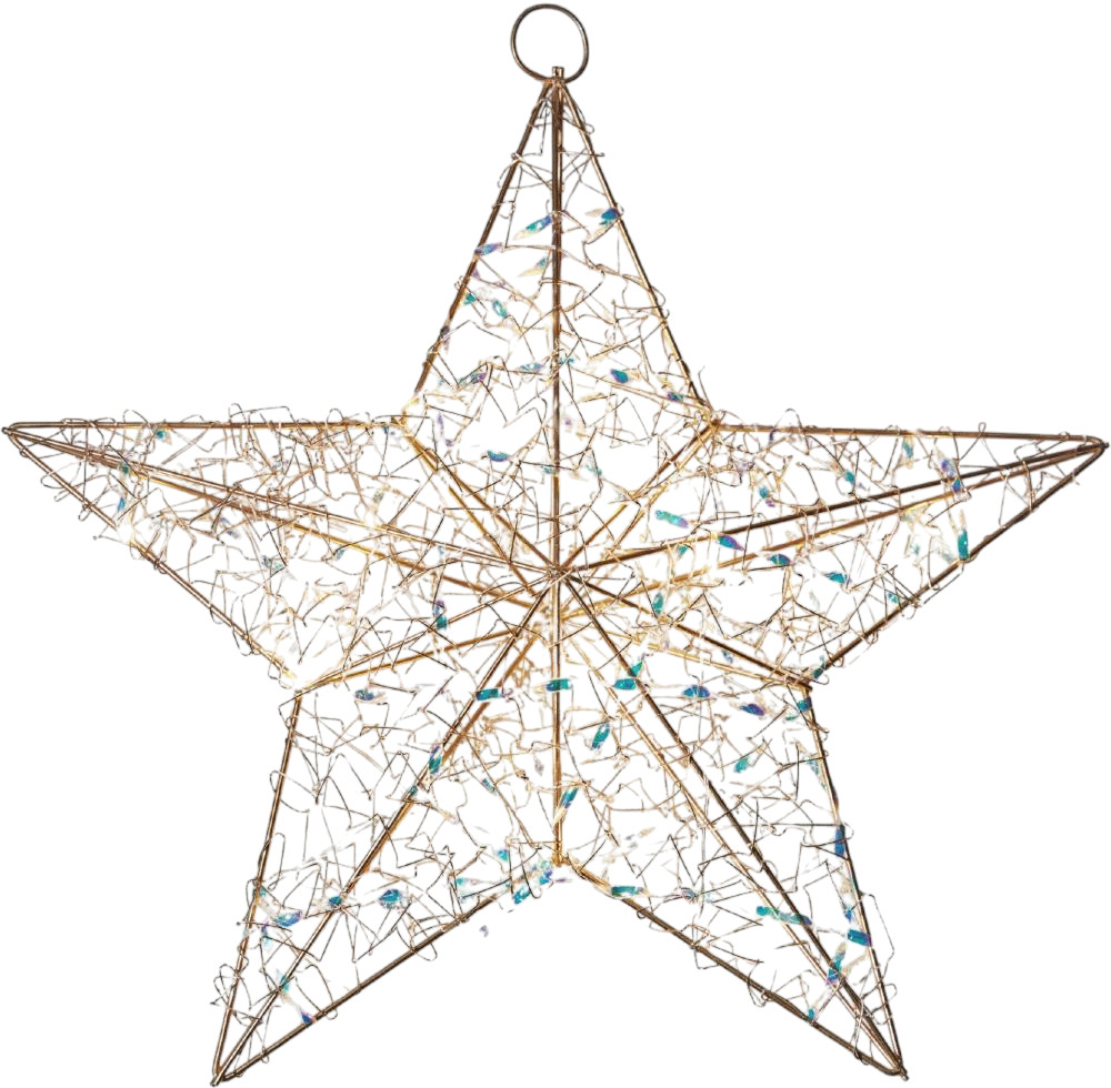 Die 20 strategisch platzierten LED-Lichter entlang der Metalldrähte erzeugen ein sanftes, gemütliches Licht, das festliche Stimmung im gesamten Raum verbreitet. Die Konstruktion aus dünnen Metalldrähten verleiht dem Stern einen leichten und eleganten Ausdruck, während der kleine Metallring an der Spitze eine einfache und flexible Aufhängung gewährleistet.