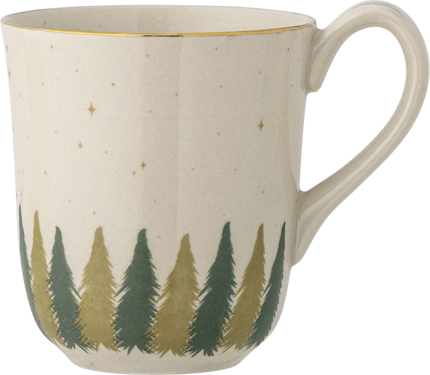 Das handwerklich verarbeitete Steinzeugmaterial garantiert dir nicht nur außergewöhnliche Haltbarkeit, sondern auch ein angenehmes Gefühl in deinen Händen. Die klassische Form macht diesen Becher zu einem vielseitigen Begleiter für den täglichen Gebrauch, während das charakteristische Motiv mit stilisierten Tannenbäumen und goldenen Sternen eine poetische Geschichte von Winterzauber erzählt.