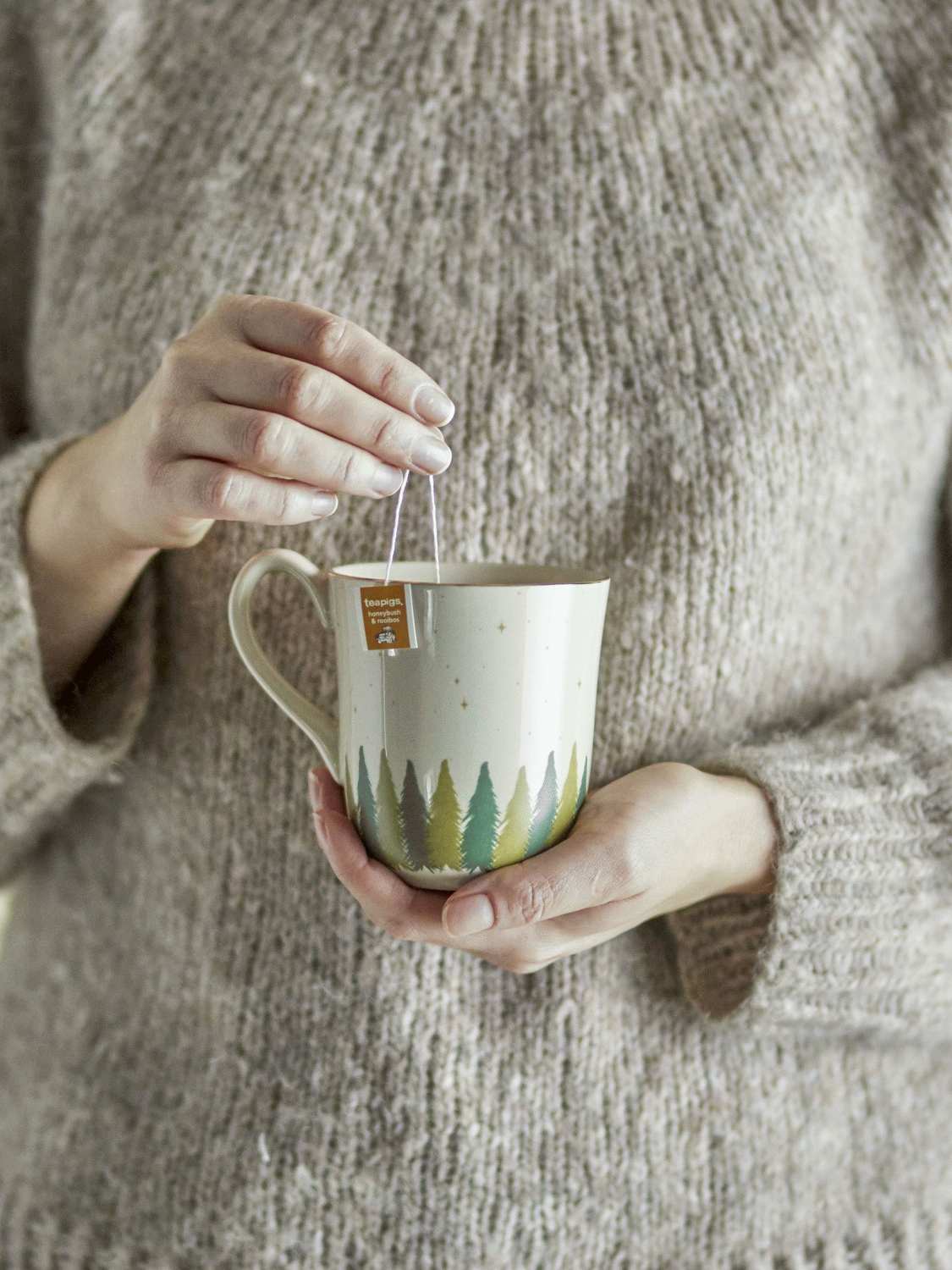 - Design: Dekoriert mit Tannenbäumen und goldenen Sternen