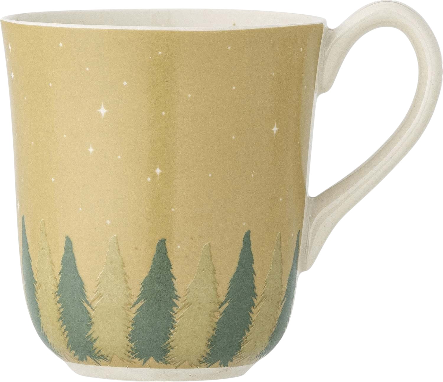Das hochwertige Steinzeug verleiht diesem Becher nicht nur außergewöhnliche Haltbarkeit, sondern auch ein angenehmes Gewicht, das perfekt in deiner Hand liegt. Die klassische Form macht ihn zum idealen Begleiter für sowohl heiße als auch kalte Getränke, während das kunstvolle Motiv mit Tannenbäumen und goldenen Sternen auf warmem gelben Untergrund jeden Moment zu etwas Besonderem macht.