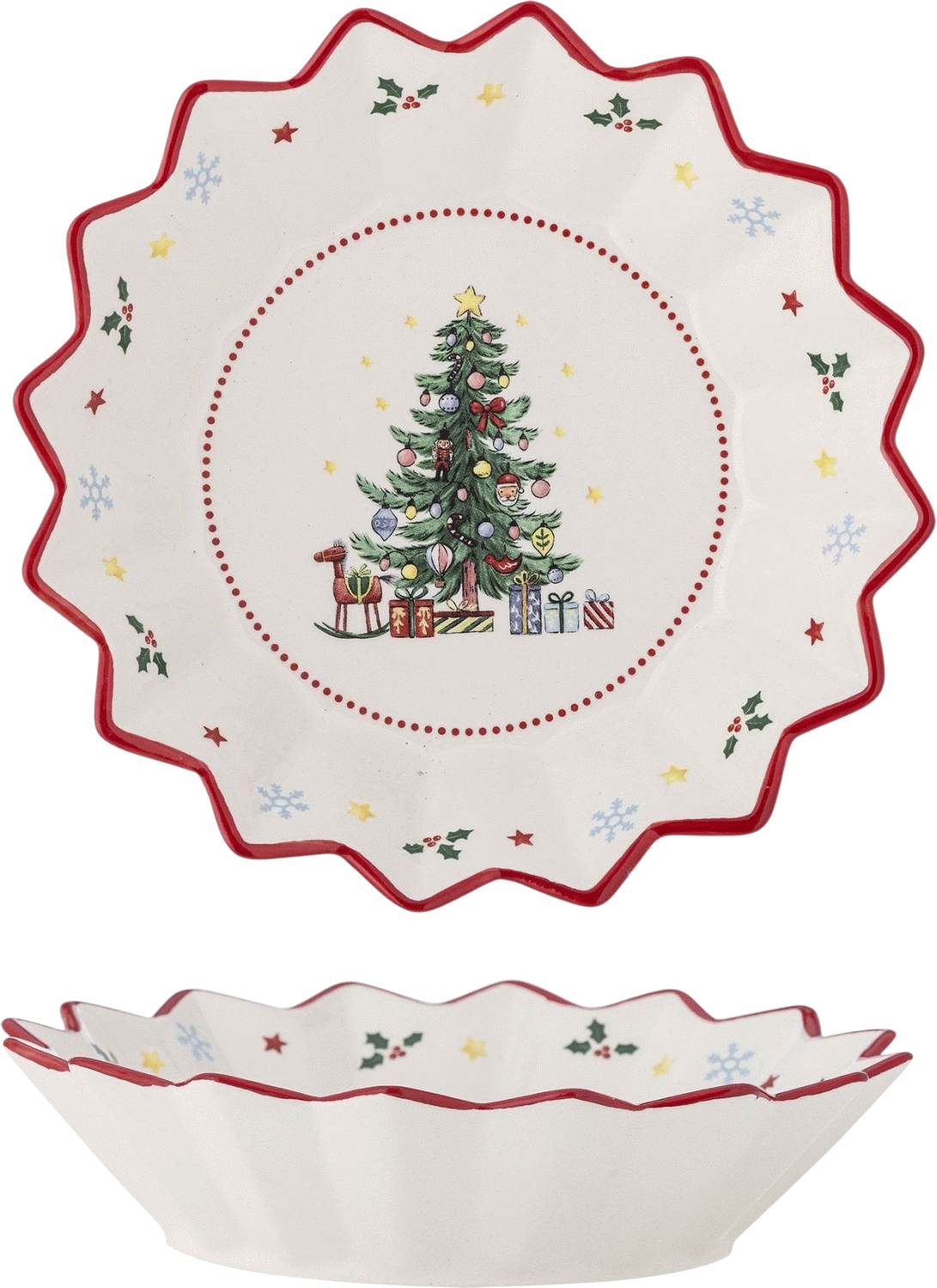 Mit dieser bezaubernden Keramikschale von Bloomingville holst du dir echte Weihnachtsstimmung in dein Zuhause. Das detailreiche Tannenbaumdesign und die klassischen Weihnachtsfiguren verwandeln jeden Tisch in eine festliche Tafel voller skandinavischer Gemütlichkeit. Die Naive-Kollektion überzeugt durch ihre handgemalte Verarbeitung, die jeder einzelnen Schale einen unverwechselbaren und persönlichen Charakter verleiht.Der rote handgemalte Rand bildet einen wunderschönen Kontrast zu den feinen Details und betont die elegante, gewellte Form der Schale. Das sorgfältig ausgeführte Weihnachtsbaumdesign fängt die traditionelle Weihnachtsgemütlichkeit ein, die so charakteristisch für skandinavisches Design ist. Mit einem Durchmesser von 20 cm eignet sich diese Schale perfekt zum Servieren von Snacks, Nüssen oder süßen Weihnachtsleckereien.