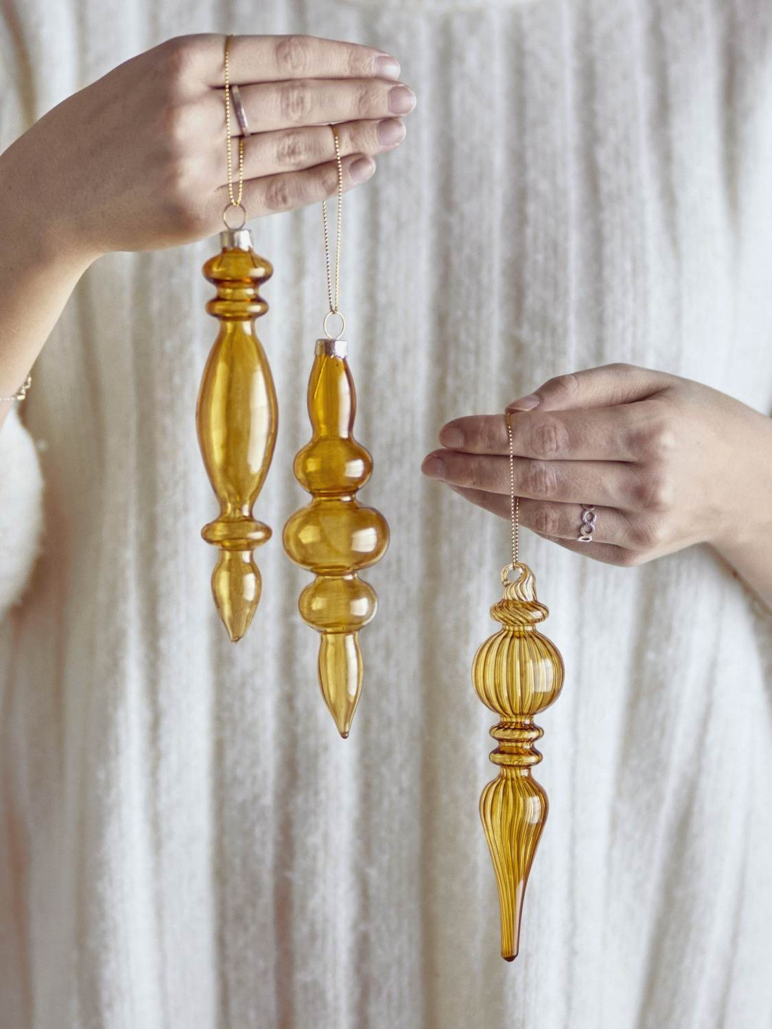 Diese exklusive Kollektion handgefertigter Glasornamente von Bloomingville verleiht deiner Weihnachtsdekoration eine besondere Elegance und Raffinesse. Das Auralia Ornament Set besteht aus drei einzigartigen Anhängern, die jeweils mit größter Sorgfalt und Präzision in goldenem Glas geformt wurden und das Licht auf bezaubernde Weise einfangen und reflektieren.Die sophistizierten Formen und das delikate Design machen diese Ornamente zu perfekten Blickfängen in deinem Weihnachtsbaum oder als Teil deiner Fensterdekoration. Der goldene Farbton schafft eine warme und luxuriöse Atmosphäre, die sowohl zu klassischen als auch modernen Einrichtungsstilen wunderschön passt.