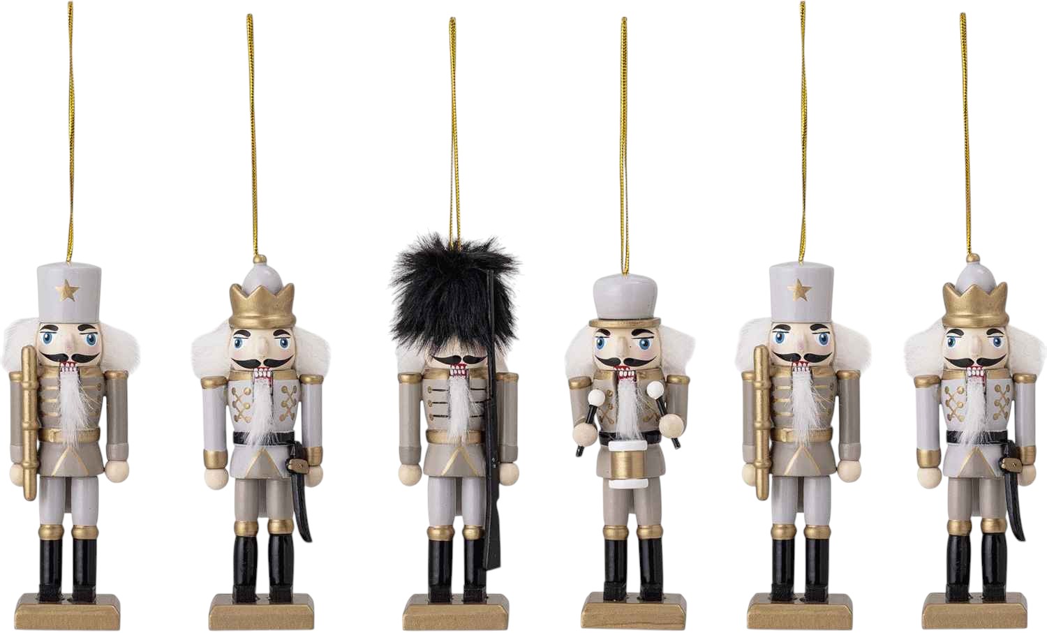 Diese bezaubernden Nussknacker-Ornamente von Bloomingville verwandeln deine Weihnachtsdekoration in ein wahres Fest für die Augen. Das 6-teilige Nikita Ornament Set präsentiert sich als charmantes Tambourkorps aus handbemaltem Fichtenholz, das skandinavische Handwerkskunst mit einem modernen Touch vereint.Jedes der sechs Ornamente wurde sorgfältig aus hochwertigem Fichtenholz geschnitzt und in einer eleganten Farbkombination aus Hellgrau und Gold handbemalt. Diese raffinierte Farbgebung verleiht den Nussknackern eine zeitlose Ausstrahlung, die sowohl zu modernen als auch traditionellen Weihnachtsdekorationen harmonisch passt. Die goldenen Akzente fangen das Licht deines Weihnachtsbaums ein und reflektieren es wunderschön, während die hellgrauen Nuancen für eine ausgewogene und sophisticated Optik sorgen.
