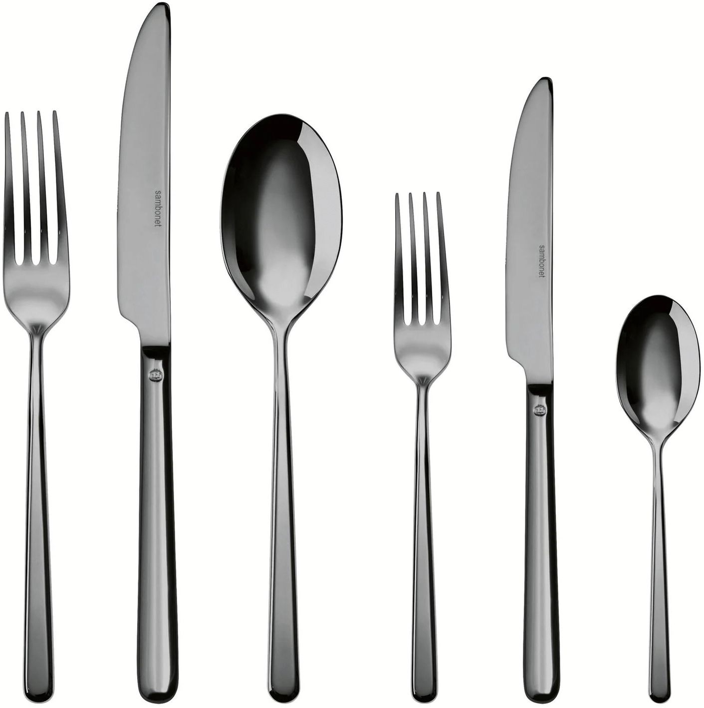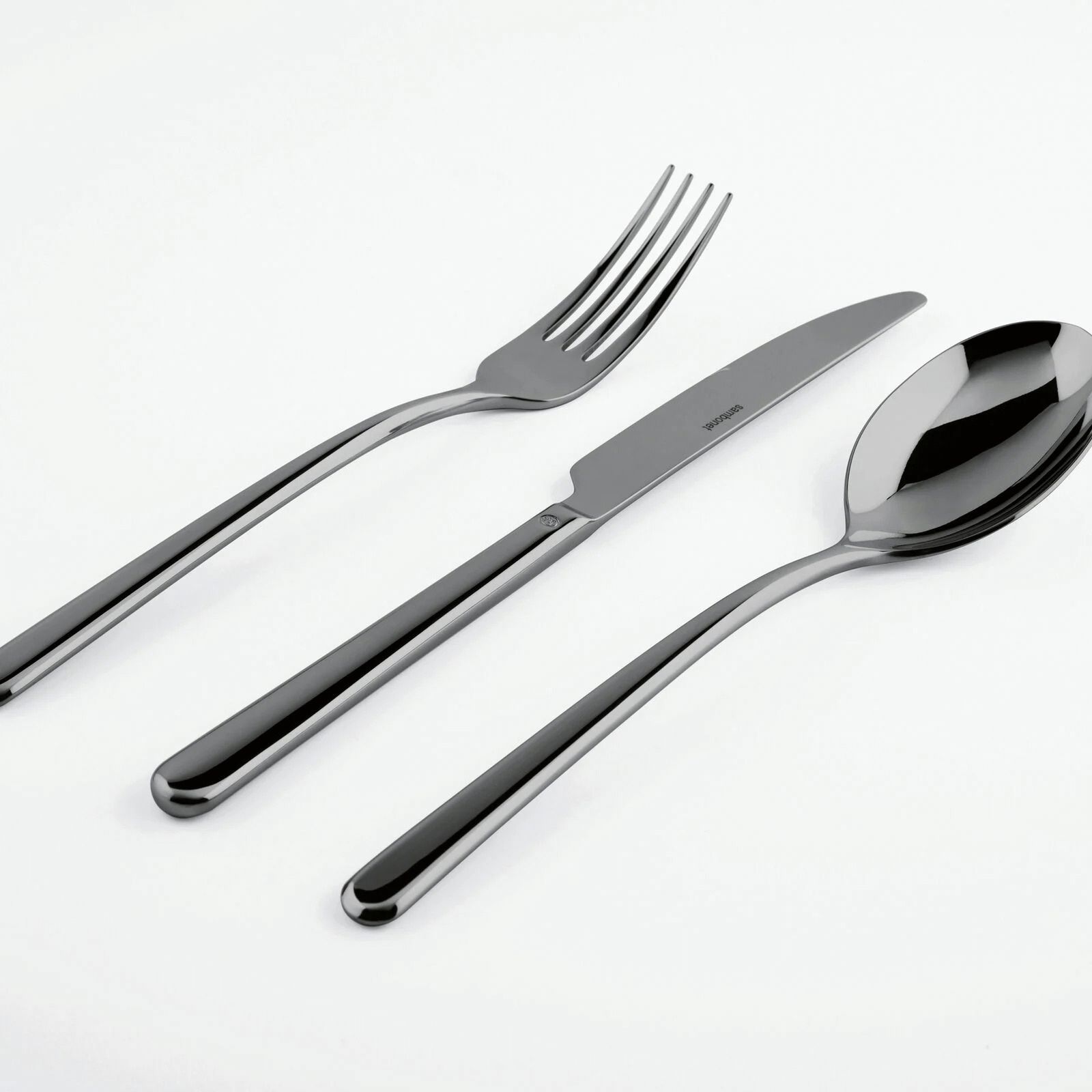 Dieses hochwertige Besteckset von Sambonet vereint funktionale Eleganz mit einem modernen Ausdruck in tiefem Schwarz und verleiht deinem Esstisch eine exklusive Note. Die Linear-Serie zeichnet sich durch präzise geometrische Formen aus, bei denen jedes einzelne Element mit größter Sorgfalt modelliert wurde. Das schwarze Finish schafft einen zeitlosen Look, der sowohl für Alltagsmahlzeiten als auch für festliche Anlässe perfekt geeignet ist.Das Besteck wird aus hochwertigem 18/10 Edelstahl gefertigt und mit fortschrittlicher PVD-Technologie (Physical Vapour Deposition) behandelt. Bei diesem Verfahren werden metallische Partikel durch Verdampfung in einer Vakuumkammer aufgetragen, wobei die Beschichtung auf atomarer Ebene mit dem Edelstahl verschweißt wird. Das Ergebnis ist ein Besteck mit außergewöhnlicher Härte und Widerstandsfähigkeit gegen Abnutzung und Korrosion, das die Bildung von Rost und Oxidation verhindert. Die PVD-Technologie verwendet ungiftige Materialien wie Titan und Zirkonium, die auch im biomedizinischen Bereich für Skalpelle und chirurgische Klingen eingesetzt werden.