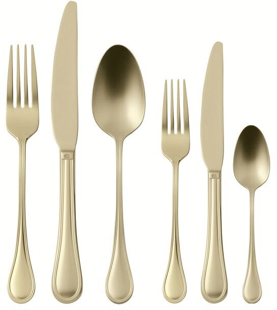 Mit diesem Sambonet Royal Besteckset in Champagne holst du dir klassische Eleganz und modernes Design zugleich an deinen Tisch. Das umfassende 36-teilige Set wurde speziell für den modernen Haushalt entwickelt, in dem Ästhetik und Funktionalität gleichermaßen zählen. Die raffinierte Oberfläche und die solide Konstruktion verleihen jeder Tischdeckung eine besondere Note und machen jede Mahlzeit zu einem stilvollen Erlebnis.Das Besteck besteht aus hochwertigem 18/10 Edelstahl mit einer Materialstärke von 3 mm, was nicht nur Langlebigkeit garantiert, sondern auch ein angenehmes Gewicht in der Hand bietet. Die champagnerfarbene Oberfläche wird durch die fortschrittliche PVD-Technik erzielt – ein innovatives Verfahren, bei dem Metallpartikel in einer Vakuumkammer verdampft werden, um die charakteristische Farbe und Nuance zu erzeugen. Das Ergebnis ist eine faszinierende matte Oberfläche, die sowohl elegant als auch zeitlos wirkt.