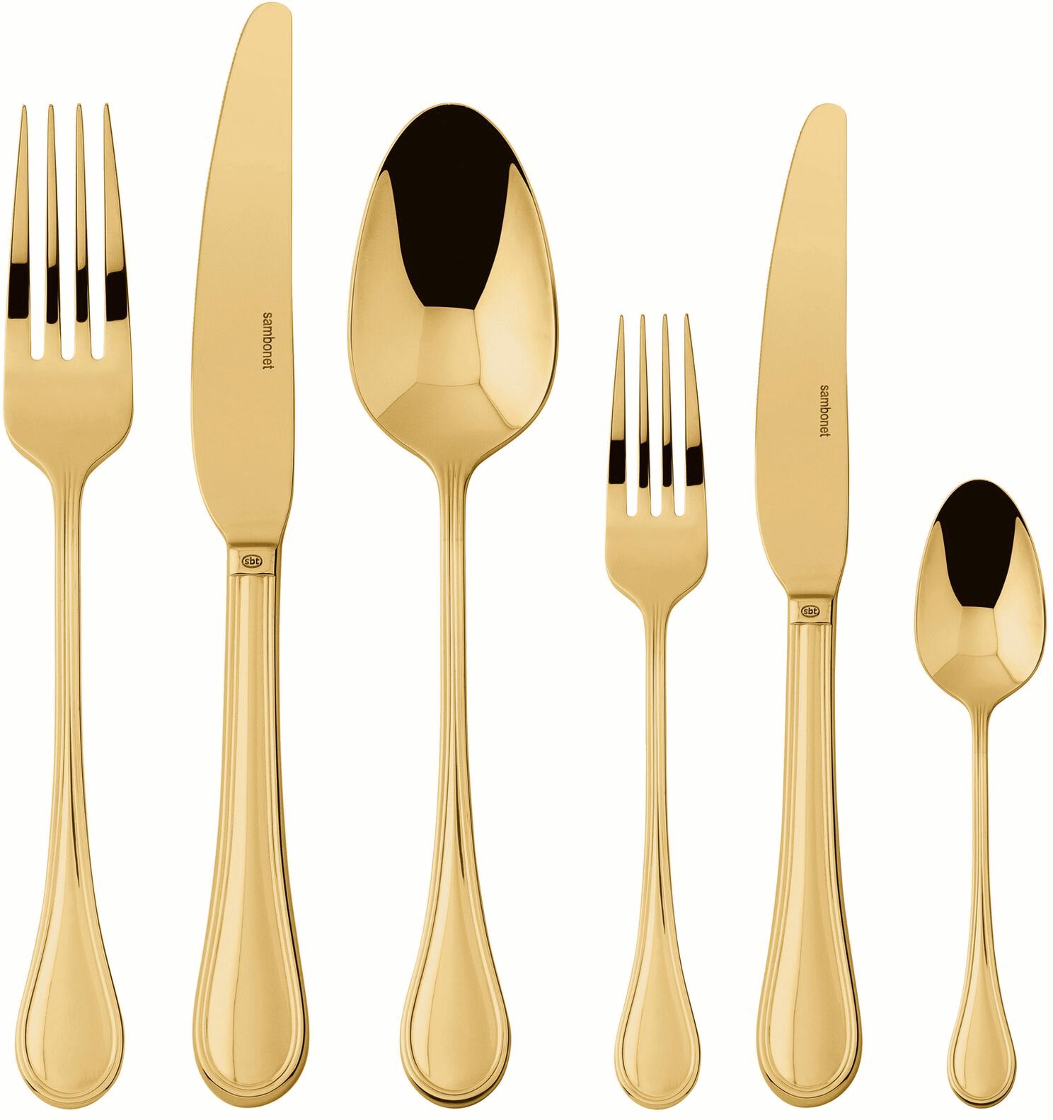 Mit dem Sambonet Royal Besteckset in Gold holst du dir klassische Eleganz und moderne Funktionalität direkt auf deinen Tisch. Dieses 36-teilige Set vereint zeitloses Design mit einer zeitgemäßen Interpretation, die sich sowohl im Alltag als auch bei festlichen Anlässen perfekt bewährt. Die charakteristische doppelte Reliefkante und der originale Sambonet-Stempel auf den Messergriffen zeugen von handwerklicher Expertise und einer langen Designtradition, die in jedem einzelnen Besteckteil spürbar wird.Jedes Stück ist aus hochwertigem 18/10 Edelstahl mit einer Materialstärke von 3 mm gefertigt, was dir ein angenehmes Gefühl von Solidität und ausgewogener Gewichtsverteilung in der Hand vermittelt. Der goldene Farbton wird durch die fortschrittliche PVD-Technologie (Physical Vapour Deposition) erzielt – ein hochmodernes Verfahren, bei dem metallische Partikel durch Verdampfung in einer Vakuumkammer aufgetragen werden. Diese Beschichtung wird auf atomarer Ebene mit dem Edelstahl verschweißt und schafft nicht nur eine wunderschöne Optik, sondern auch eine außergewöhnlich widerstandsfähige Oberfläche gegen Abnutzung und Korrosion. Die PVD-Beschichtung verhindert die Bildung von Rost oder Oxidation und nutzt ungiftige Materialien wie Titan und Zirkonium – so sicher, dass sie auch im biomedizinischen Bereich für Skalpelle und chirurgische Instrumente eingesetzt wird.