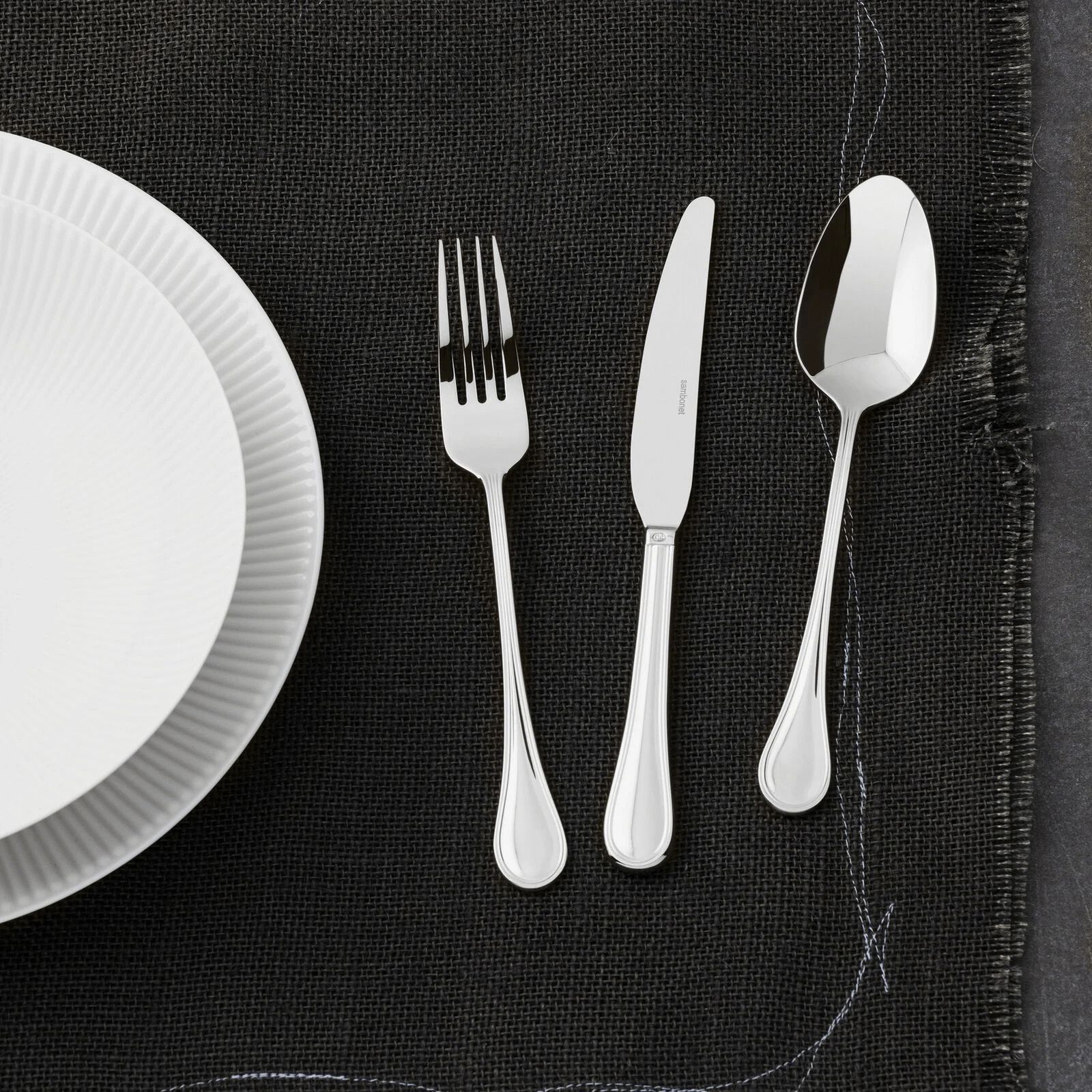 Das Set besteht aus: 6 Esslöffel, 6 Essmesser, 6 Essgabeln, 6 Dessertmesser, 6 Dessertgabeln und 6 Teelöffel.