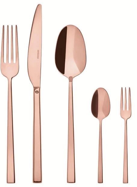 Dieses beeindruckende Besteckset vereint skandinavisches Design mit innovativer Technologie und bringt durch seine kupferfarbene Oberfläche eine besondere Wärme und Persönlichkeit auf deinen Tisch. Das 60-teilige Set von Sambonet bietet dir eine komplette Ausstattung für zwölf Personen und eignet sich sowohl für den Alltag als auch für festliche Anlässe. Die markanten, kantigen Linien und die solide Materialstärke aus Edelstahl schaffen einen einzigartigen Ausdruck, der sich deutlich von traditionellen Besteckdesigns abhebt.Jedes Teil ist aus hochwertigem 18/10 Edelstahl gefertigt, was dir eine lange Lebensdauer und dauerhaften Glanz garantiert. Die trendige Kupferfarbe entsteht durch Sambonets fortschrittliche PVD-Technologie (Physical Vapour Deposition), die keine einfache Beschichtung darstellt, sondern eine atomare Verschweißung mit der Oberfläche. Dieser Prozess verleiht dem Material außergewöhnliche Härte und Widerstandsfähigkeit gegen Abnutzung, Kratzer und Korrosion, während er gleichzeitig die charakteristische Kupfernuance erzeugt, die sich in wunderschönen Schattierungen entfaltet.