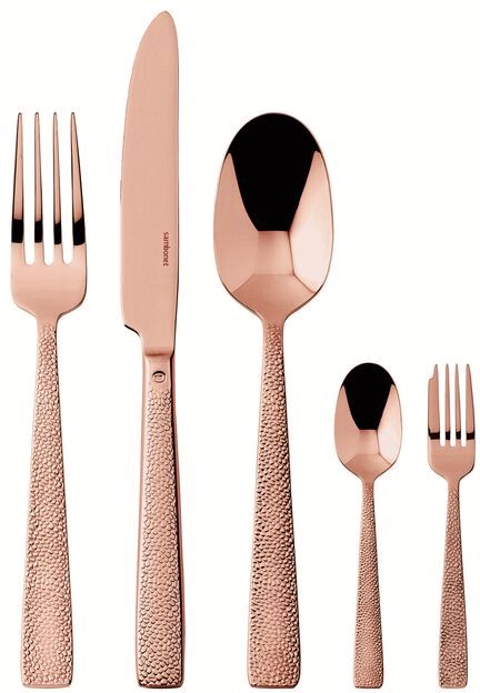 Mit diesem 30-teiligen Besteckset von Sambonet verwandelst du deine Tafel in einen Schauplatz zeitgenössischer Eleganz, bei dem jedes einzelne Teil zum Blickfang wird. Die charakteristische Textur und die erhabene Reliefoberfläche heben dieses Besteck deutlich von herkömmlichen Designs ab und verleihen deinem gedeckten Tisch eine unverwechselbare Note. Die beidseitig geprägte Oberfläche entsteht bereits während des Gießprozesses, wodurch eine besonders langlebige Verarbeitung gewährleistet wird, die auch intensiver Nutzung standhält. Inspiriert von internationalen Jetset-Destinationen, schafft dieses Set eine raffinierte Atmosphäre bei jedem Essen – ob im Alltag oder zu besonderen Anlässen.Jedes Teil ist aus hochwertigem 18/10 Edelstahl gefertigt, der für seine außergewöhnliche Festigkeit und Langlebigkeit bekannt ist. Die kupferfarbene Oberfläche wird durch PVD-Technologie (Physical Vapour Deposition) erzielt, ein fortschrittliches Verfahren, bei dem metallische Partikel in einer Vakuumkammer aufgedampft und auf atomarer Ebene mit dem Edelstahl verschweißt werden. Diese Methode verleiht dem Material eine außergewöhnliche Härte und macht es äußerst widerstandsfähig gegen Kratzer und Korrosion. Die PVD-Behandlung verwendet ungiftige Materialien wie Titan und Zirkonium und kommt auch im biomedizinischen Bereich zum Einsatz – ein Beweis für ihre Qualität und Sicherheit.