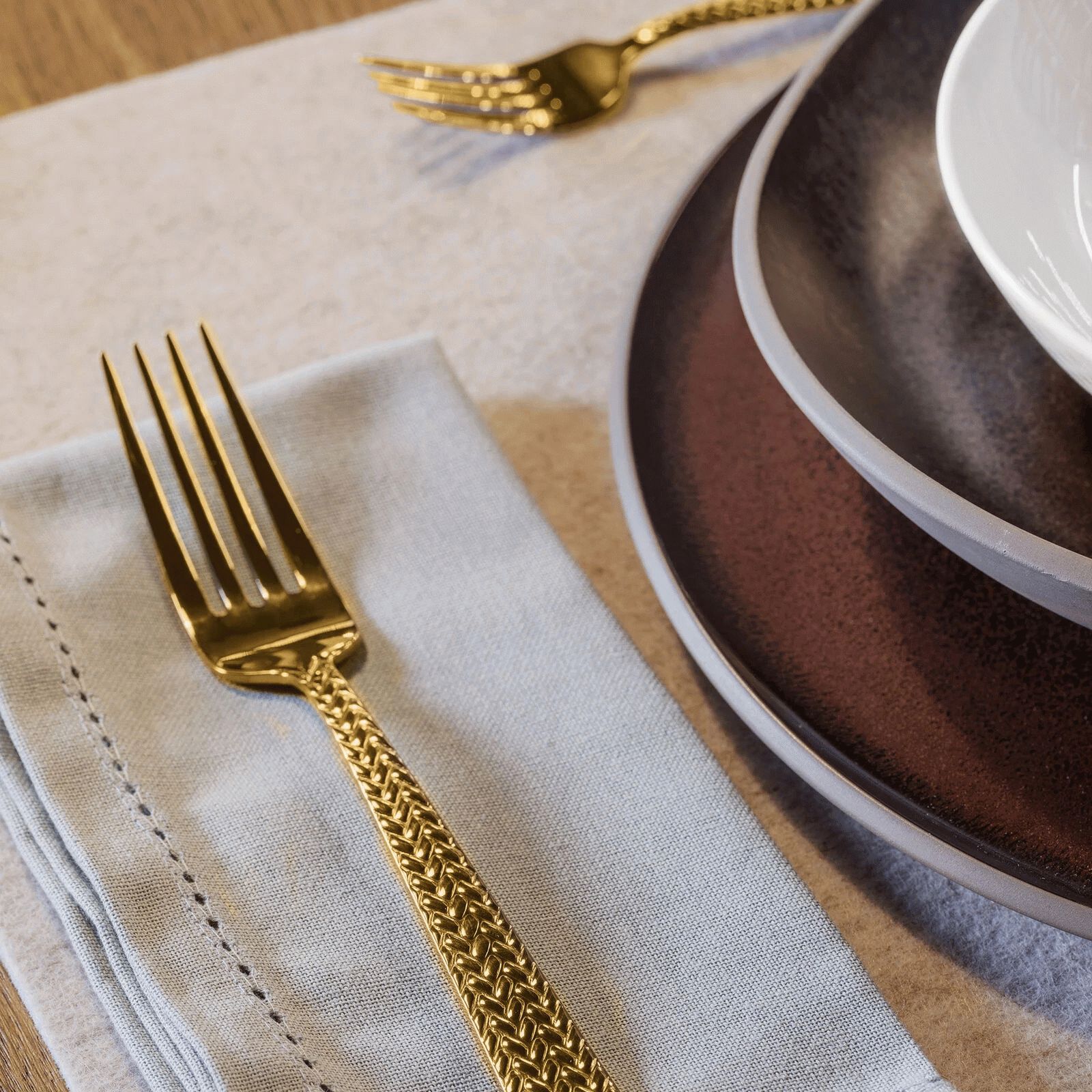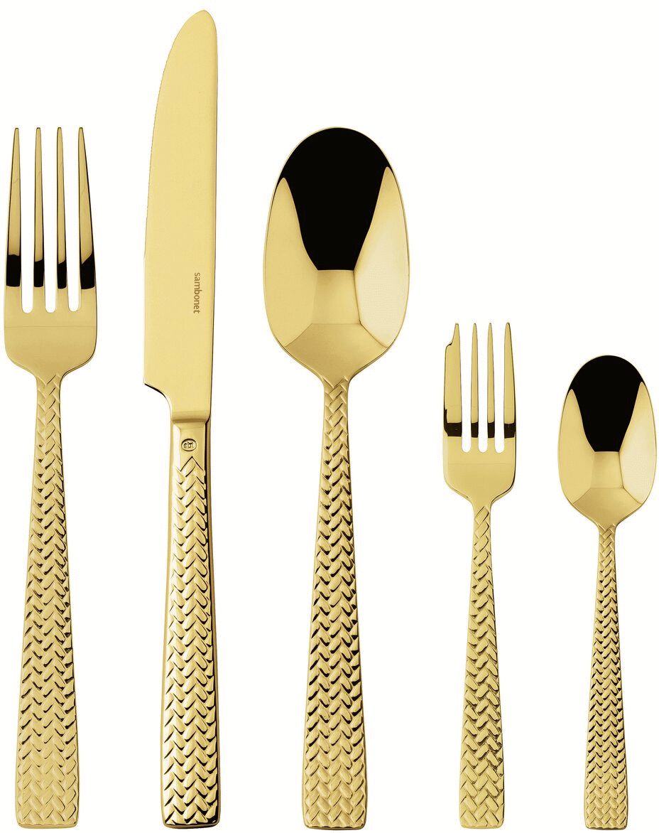 Dieses exklusive 30-teilige Besteckset in Gold verleiht deinem Tisch sofort eine moderne Eleganz, die jeden Anlass zu etwas Besonderem macht. Die charakteristische texturierte Oberfläche macht jedes einzelne Besteckteil zu einem zentralen Element deiner Tischdekoration und bringt den Charme handgefertigter Gegenstände in dein Zuhause. Inspiriert von modischen Ferienzielen und internationalen Jet-Set-Locations verbindet dieses Besteckset skandinavische Funktionalität mit zeitgemäßem Design auf einzigartige Weise.Jedes Teil ist aus hochwertigem 18/10 Edelstahl gefertigt und mit einer PVD-Beschichtung veredelt, die für die wunderschöne Goldfarbe sorgt. PVD steht für Physical Vapour Deposition – ein fortschrittliches Oberflächenverfahren, bei dem metallische Partikel durch Verdampfung in einer Vakuumkammer aufgetragen werden. Die Beschichtung verschmilzt auf atomarer Ebene mit dem Stahl und verleiht dem Material außergewöhnliche Härte sowie bemerkenswerte Widerstandsfähigkeit gegen Abnutzung und Korrosion. Diese Technologie wird dank der Verwendung ungiftiger Materialien wie Titan und Zirkonium sogar in der Biomedizin eingesetzt.