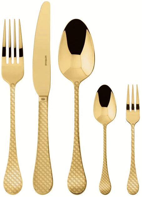 Mit diesem luxuriösen Besteckset von Sambonet holst du dir ein Stück sizilianische Kunsttradition direkt auf deinen Tisch. Das 30-teilige Set in strahlendem Gold verwandelt jede Mahlzeit in ein ästhetisches Erlebnis, bei dem das Besteck nicht nur Beiwerk ist, sondern zum zentralen Element deiner Tischdekoration wird. Inspiriert von der kulturellen Vielfalt der sizilianischen Küstenstadt Taormina vereint das Design geometrische Ornamente, die auf byzantinische und sizilianische Kunsttraditionen zurückgreifen.Das Besondere an der Taormina-Serie ist die einzigartige Textur, die durch ein doppelseitiges Relief entsteht. Dieses wird bereits während des Gusses jedes einzelnen Teils geformt, wodurch die Details tief im Material verankert sind und selbst nach jahrelangem Gebrauch ihre Schönheit bewahren. Jedes Stück besteht aus hochwertigem 18/10 Edelstahl und wird mit Sambonets patentierter PVD-Technologie (Physical Vapour Deposition) veredelt. Bei diesem fortschrittlichen Verfahren wird die Farbe auf atomarer Ebene mit der Oberfläche verbunden, indem metallische Partikel – darunter Titan und Zirkonium, die auch in der Biomedizin Verwendung finden – in einer Vakuumkammer aufgetragen werden. Diese Methode ist weit mehr als eine einfache Beschichtung: Sie verleiht dem Besteck einen außergewöhnlichen Goldton mit höherem Glanz als bei herkömmlichen Produkten und macht es extrem widerstandsfähig gegen Kratzer, Abnutzung, Rost und Oxidation.