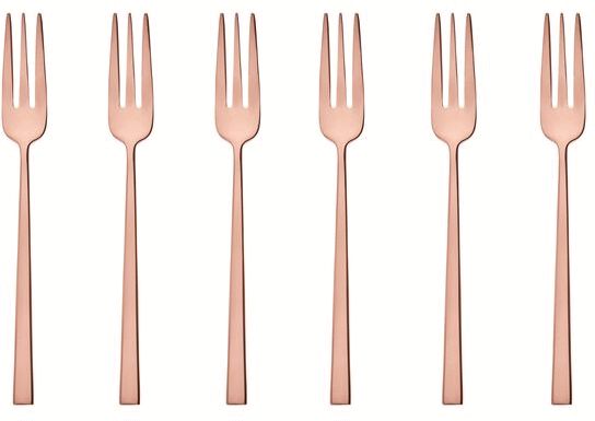 Mit diesem Set aus sechs Kuchengabeln bringst du eine außergewöhnliche Kombination aus kantigem Design und warmer Kupferoptik an deinen Tisch. Die markanten, quadratischen Linien und die kraftvolle Formgebung verleihen jedem Gedeck Persönlichkeit und Entschlossenheit, während das kupferfarbene Finish eine einladende, energiegeladene Atmosphäre schafft – perfekt für alle, die Wert auf zeitgemäße Ästhetik und hochwertige Handwerkskunst legen.Die Rock-Serie von Sambonet vereint skandinavische Designklarheit mit italienischer Fertigungsexzellenz. Jede Gabel ist aus robustem 18/10 Edelstahl gefertigt, einem Material, das für seine Langlebigkeit und dauerhafte Qualität bekannt ist. Doch das Besondere liegt in der innovativen PVD-Behandlung: Diese fortschrittliche Technologie – Physical Vapour Deposition – ist weit mehr als eine einfache Beschichtung. Metallische Partikel werden in einer Vakuumkammer verdampft und auf atomarer Ebene mit der Stahloberfläche verschweißt. Das Ergebnis ist eine außergewöhnliche Widerstandsfähigkeit gegen Abrieb, Kratzer, Rost und Oxidation.