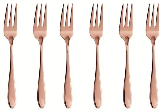 Mit diesem hochwertigen Set von sechs Kuchengabeln aus der Velvet-Serie von Sambonet holst du dir skandinavisches Design und außergewöhnliche Funktionalität direkt auf deinen Tisch. Die kupferfarbenen Gabelchen verbinden elegante Ästhetik mit langlebiger Qualität und setzen bei jedem Anlass – ob beim gemütlichen Kaffeekränzchen am Nachmittag oder beim festlichen Dessertabend – stilvolle Akzente.Jede Gabel ist aus erstklassigem 18/10 Edelstahl gefertigt und mit einer innovativen PVD-Beschichtung veredelt, die dem Besteck seine charakteristische Kupferfarbe verleiht. Die Physical Vapour Deposition (PVD) ist ein hochmodernes Verfahren, bei dem Metallpartikel in einer Vakuumkammer verdampft und auf atomarer Ebene mit dem Edelstahl verschweißt werden. Dadurch erhält das Material eine außergewöhnliche Härte und Widerstandsfähigkeit gegen Abnutzung, Korrosion und Rost. Die Beschichtung nutzt ungiftige Materialien wie Titan und Zirkonium – Substanzen, die so sicher sind, dass sie auch in der Biomedizin für Skalpelle und chirurgische Instrumente eingesetzt werden. Diese Technologie garantiert, dass deine Kuchengabeln über viele Jahre hinweg ihr schönes Aussehen bewahren.