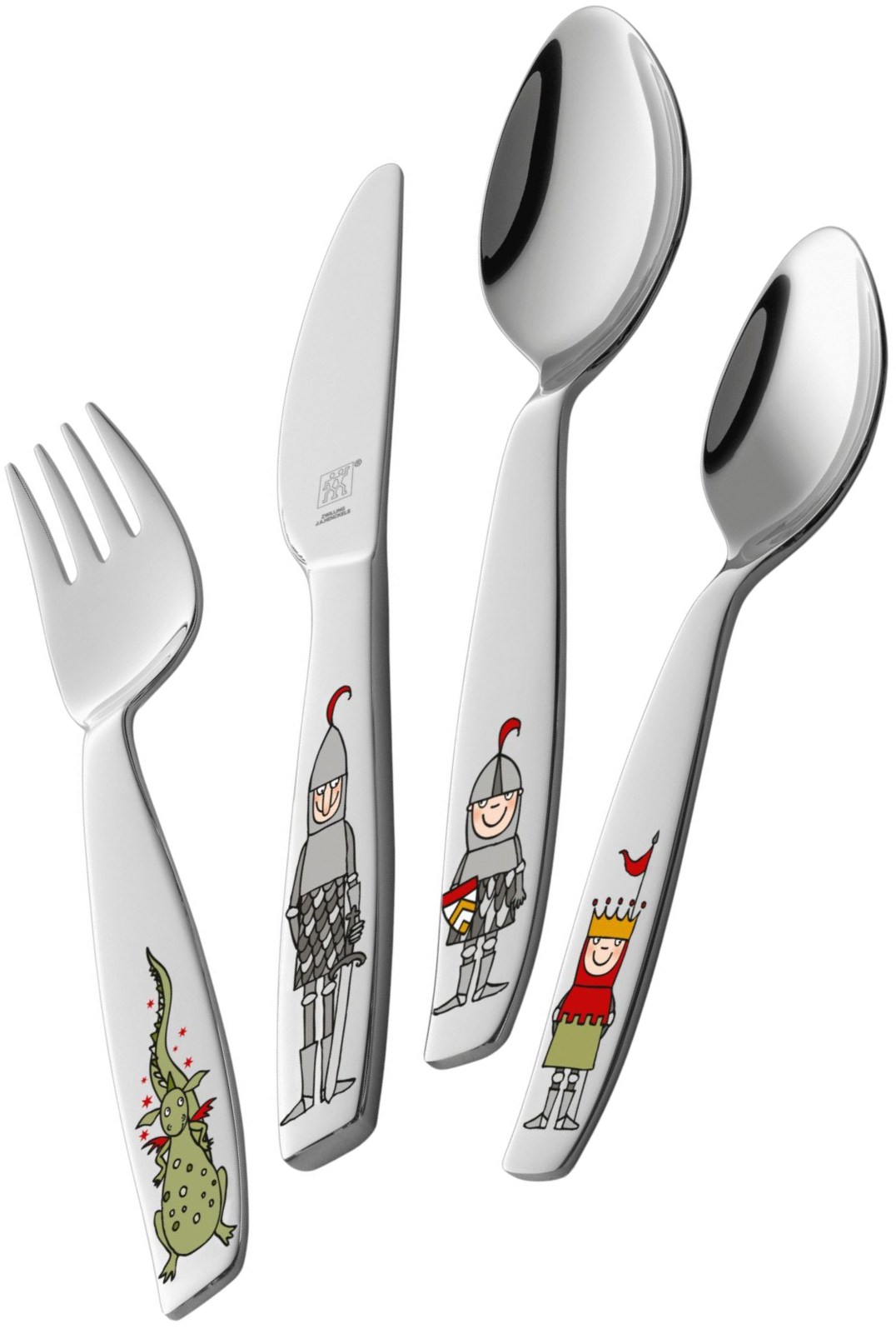 Mit diesem zauberhaften Kinderbesteckset verwandelst du jede Mahlzeit in ein spannendes Ritterabenteuer für deine kleinen Familienmitglieder. Das vierteilige Zwilling Ritter Eckbert Set wurde speziell für Kinderhände entwickelt, die bereit sind, die Kunst des Essens mit echtem Besteck zu meistern.Die charmanten Ritterfiguren, die jedes einzelne Besteckteil schmücken, schaffen eine magische Atmosphäre am Esstisch und machen jede Mahlzeit zu einer aufregenden Zeitreise ins Mittelalter. Du kannst dich auf die erstklassige Qualität verlassen, die du von ZWILLING erwartest. Das Besteck ist aus langlebigem 18/10 Edelstahl gefertigt, der nicht nur eine lange Lebensdauer gewährleistet, sondern auch dem täglichen Gebrauch durch aktive Kinder standhält.