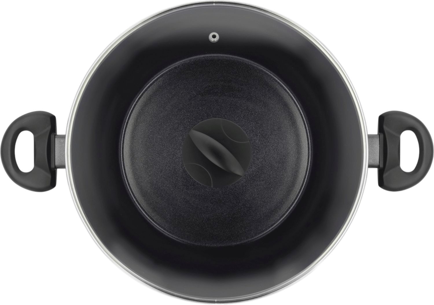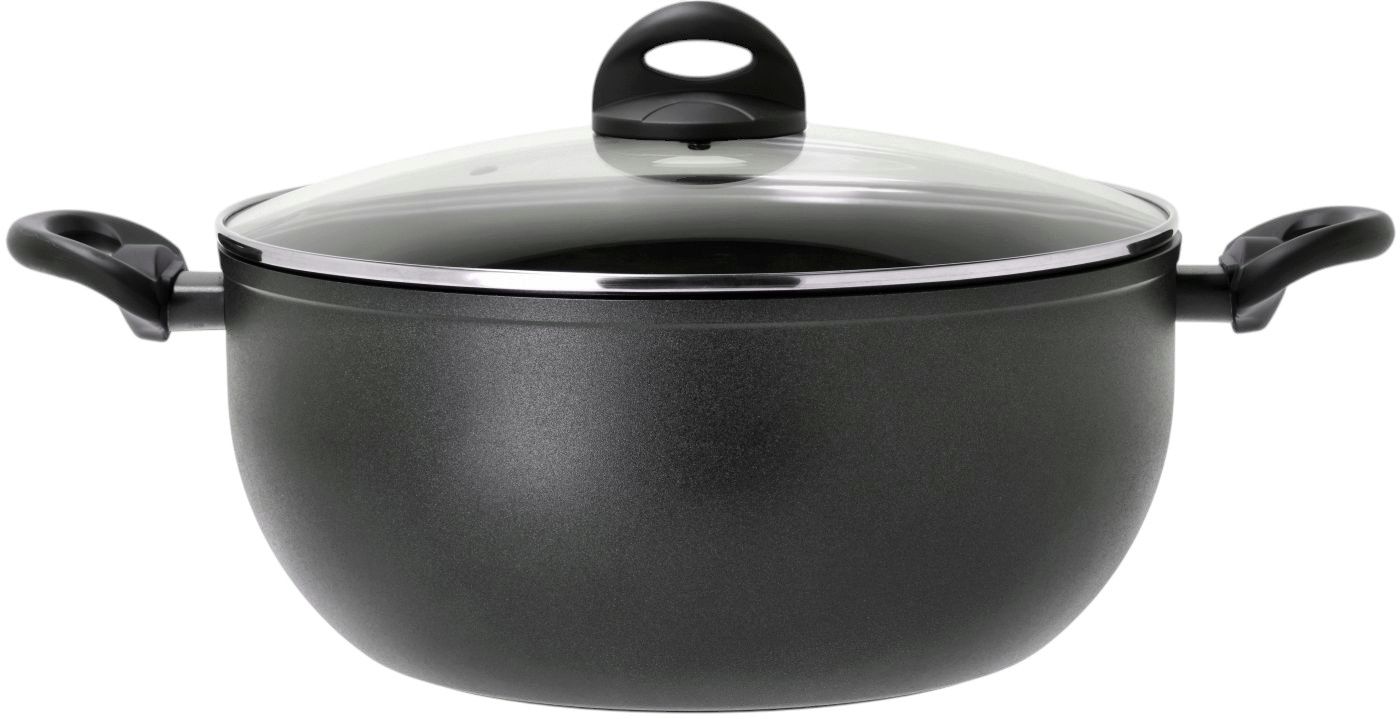 Die breite Bodenfläche eignet sich hervorragend zum Anbraten von Fleisch oder zur Zubereitung größerer Portionen. Der mitgelieferte Glasdeckel mit praktischem Dampfloch ermöglicht es dir, den Garprozess zu beobachten, ohne Wärme und Feuchtigkeit zu verlieren. Die ergonomischen Griffe gewährleisten eine sichere Handhabung auch bei hohen Temperaturen.