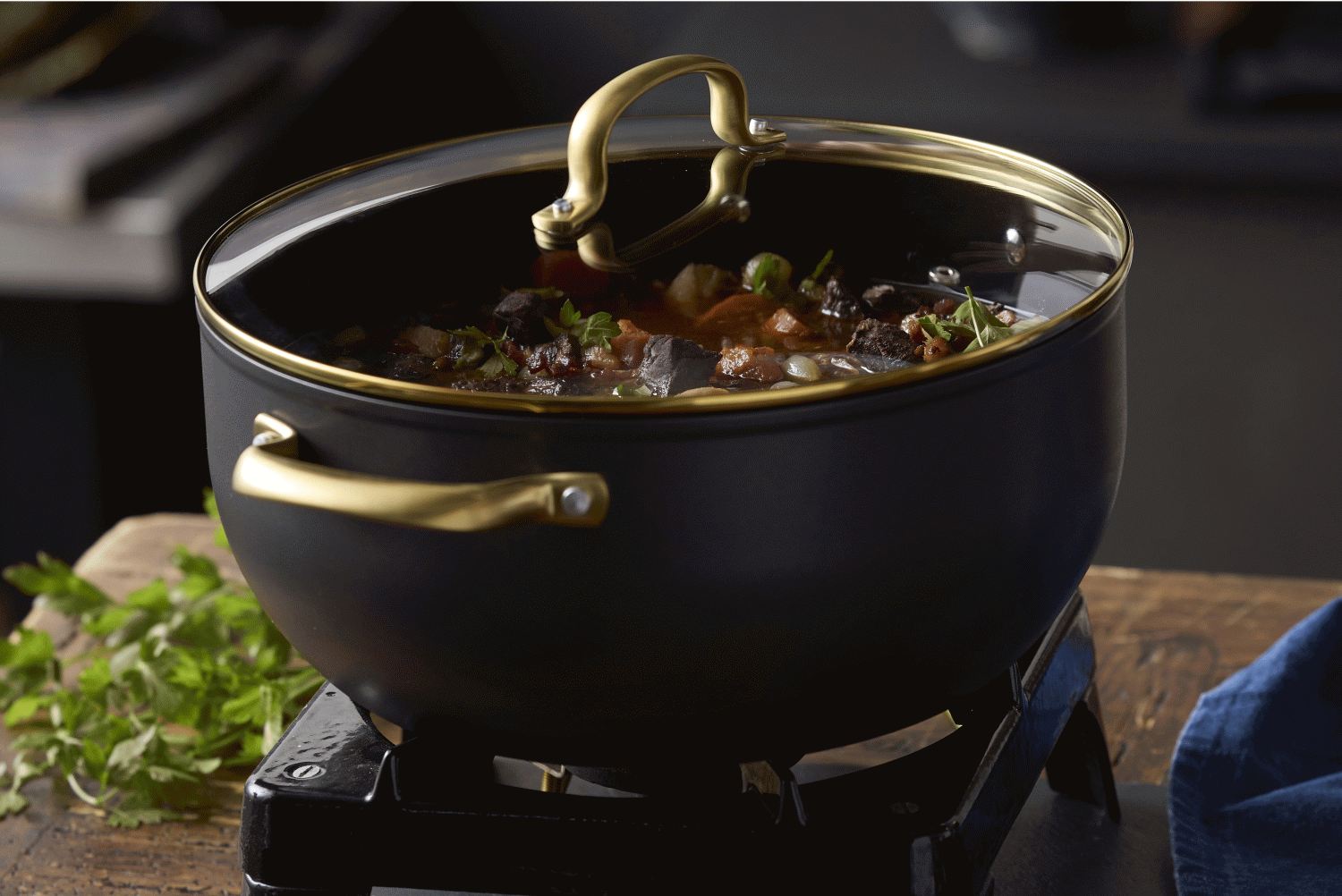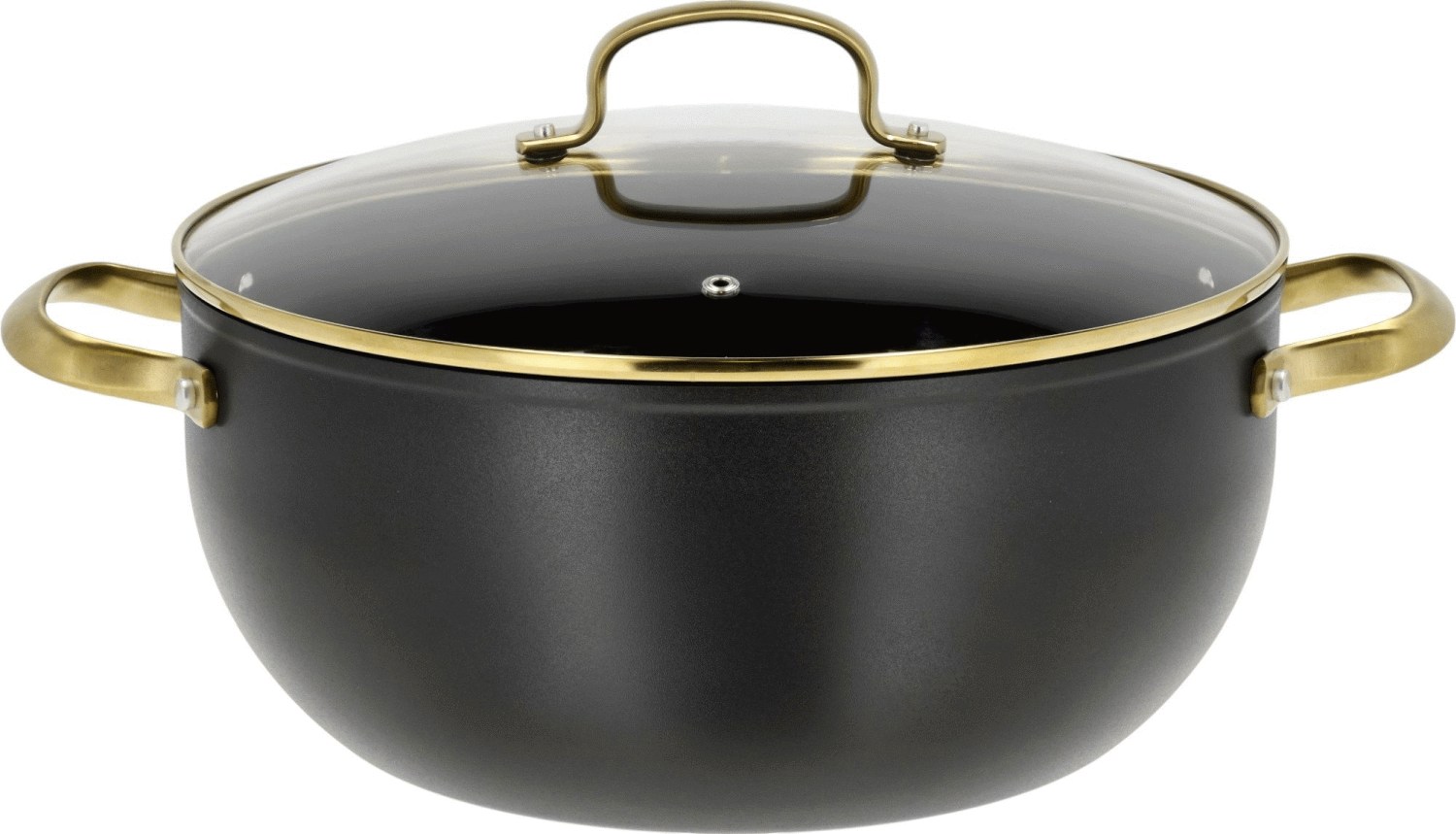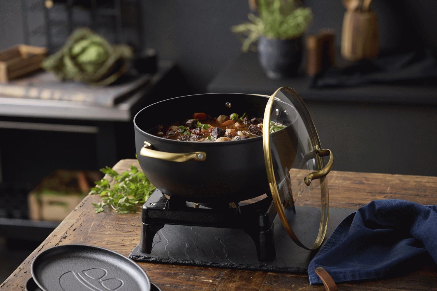 Die hochwertige Aluminiumkonstruktion sorgt für eine gleichmäßige Wärmeverteilung, während die keramische Innenbeschichtung optimale Kochergebnisse garantiert. Das schwarze Finish verleiht dem Topf einen zeitlosen, modernen Look, der durch die matten messingfarbenen Griffe und Details perfekt ergänzt wird – ein echter Blickfang, der die skandinavische Designphilosophie widerspiegelt.