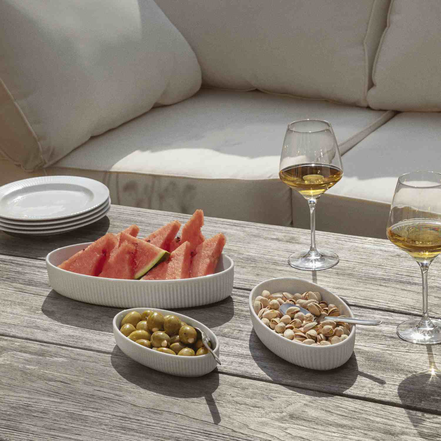 Mit dieser ovalen Schale aus weißem Porzellan bringst du skandinavische Eleganz und durchdachte Funktionalität in deine Küche. Die charakteristische Form mit 26 cm Breite macht sie zu einem vielseitigen Begleiter – ob für den schnellen Salat am Abend oder für festliche Aufläufe, wenn Gäste kommen. Das klassische Weiß lässt deine Speisen wunderbar zur Geltung kommen und sorgt für ein harmonisches Gesamtbild auf dem Tisch.Die markanten Rillen der Legio Nova-Serie verleihen der Schale eine raffinierte Optik mit Tiefe und Dimension. Statt der üblichen runden Form setzt die schlanke, ovale Gestaltung einen modernen Akzent in deiner Tischdekoration und bietet gleichzeitig großzügig Platz für Salate, Gratins oder Beilagen. Das zeitlose Design fügt sich mühelos in jeden Einrichtungsstil ein – von puristisch bis gemütlich.