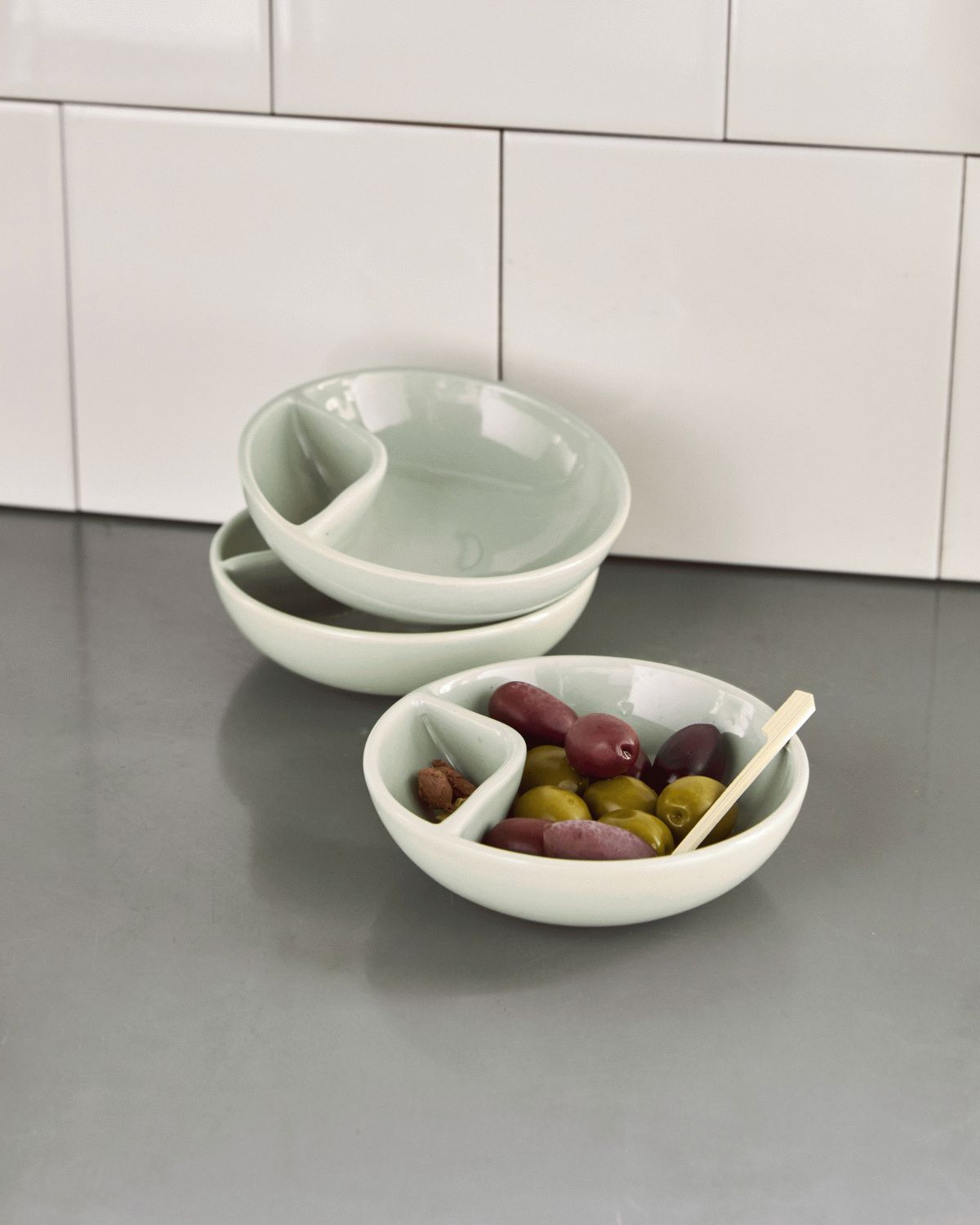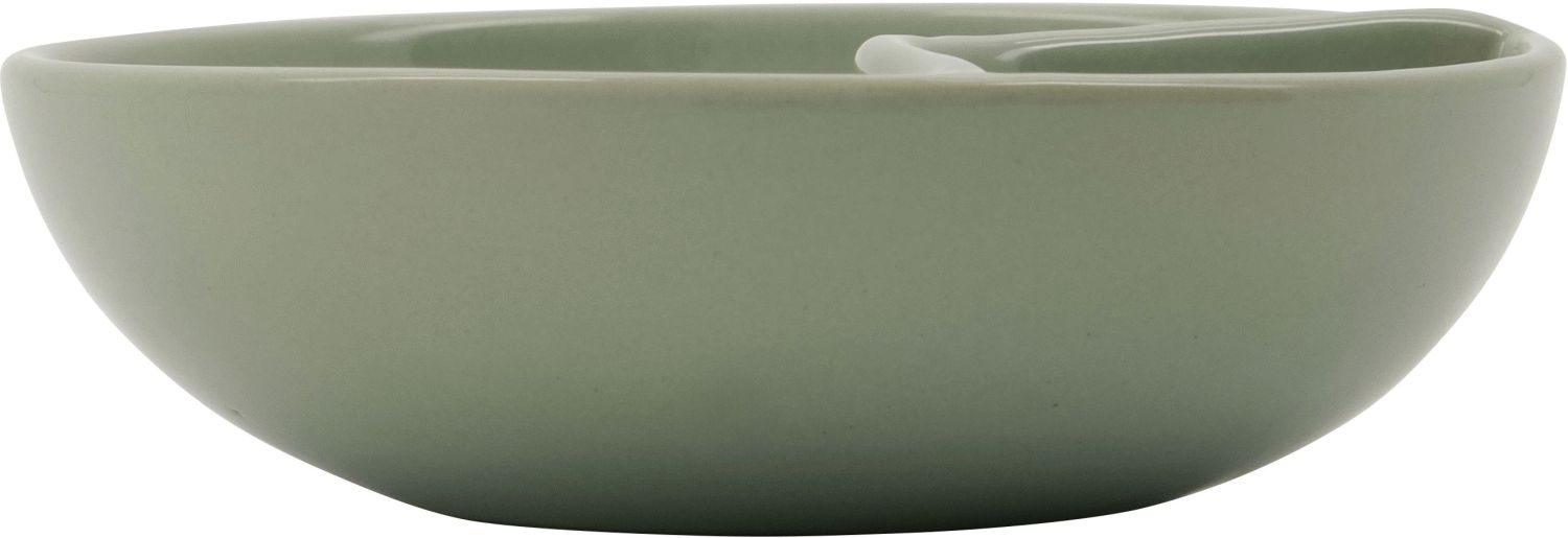 Diese mintgrüne Servierschale aus Steinzeug von Nicolas Vahé verbindet durchdachte Funktionalität mit skandinavischem Charme und macht das Servieren von Oliven, Nüssen und anderen Snacks zu einem echten Erlebnis. Das clevere zweigeteilte Design ermöglicht es dir, Oliven und Nüsse stilvoll zu präsentieren, während Kerne und Schalen praktisch im separaten Fach landen. So genießen deine Gäste ihre Snacks ganz entspannt, ohne sich Gedanken über die Entsorgung machen zu müssen. Das handgefertigte Steinzeug verleiht jeder Schale einen individuellen Charakter mit subtilen Variationen in Farbe und Finish, die das authentische Handwerk hinter dem Produkt unterstreichen.Die mintgrüne Glasur setzt einen frischen, modernen Akzent auf deiner Tafel und fügt sich sowohl in entspannte Alltagsmomente als auch in festliche Anlässe harmonisch ein. Mit einem Durchmesser von 12 cm und einer Höhe von 3,5 cm ist die Schale ideal für kleinere Portionen und lässt sich wunderbar in ein größeres Servierarrangement integrieren. Ihr kompaktes Format sorgt dafür, dass sie auf dem Tisch nicht zu viel Platz einnimmt, während die zweigeteilte Konstruktion maximalen Komfort bietet.
