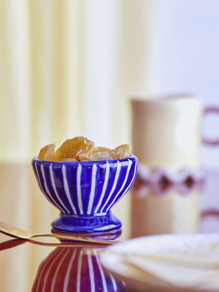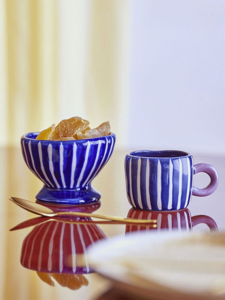 Diese handbemalte Schale aus Steinzeug von Bloomingville vereint skandinavisches Handwerk mit zeitloser Ästhetik und bringt Charme sowie Persönlichkeit auf deinen Tisch. Die sanft gewellte Form und der ausgestellte Fuß verleihen der Nini Schale ein elegantes, leicht erhöhtes Erscheinungsbild, das sowohl im Alltag als auch zu festlichen Anlässen eine gute Figur macht. Die glänzende blaue Glasur mit vertikalen elfenbeinfarbenen Streifen erzeugt einen visuell interessanten Akzent, der ins Auge fällt, ohne aufdringlich zu wirken.Dank der handbemalten Technik weist jede Schale kleine natürliche Variationen in Muster und Farbintensität auf – so wird dein Exemplar zum echten Unikat mit Seele und Charakter. Mit einem Durchmesser von 9 cm und einer Höhe von 6,5 cm ist diese kleine Schale vielseitig einsetzbar: Serviere darin Snacks, Nüsse, Dips oder kleine Desserts, nutze sie als Salz- oder Gewürzschälchen oder bewahre Schmuck und Kleinigkeiten im Bad oder Eingangsbereich darin auf. Das robuste Steinzeug ist für den täglichen Gebrauch bestens geeignet, während das raffinierte Design selbst einfachste Anrichtungen aufwertet.