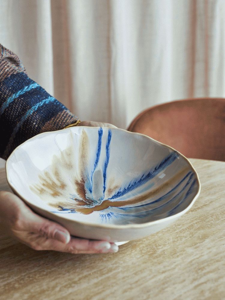 Das besondere Merkmal der Imogen Schale ist ihre reaktive Glasur, die jeder Schale einen individuellen Charakter verleiht. Die sanften beigen Grundtöne harmonieren wunderbar mit fließenden blauen Nuancen und warmen braunen Akzenten, die der Oberfläche Tiefe und Lebendigkeit schenken. Dank der speziellen Glasurtechnik entstehen während des Brennvorgangs natürliche Variationen in Muster und Farbintensität – das bedeutet, dass keine zwei Schalen exakt gleich aussehen. So erhältst du ein Unikat mit handwerklicher Qualität, das die Liebe zum Detail und die Kunstfertigkeit skandinavischer Designtradition widerspiegelt.