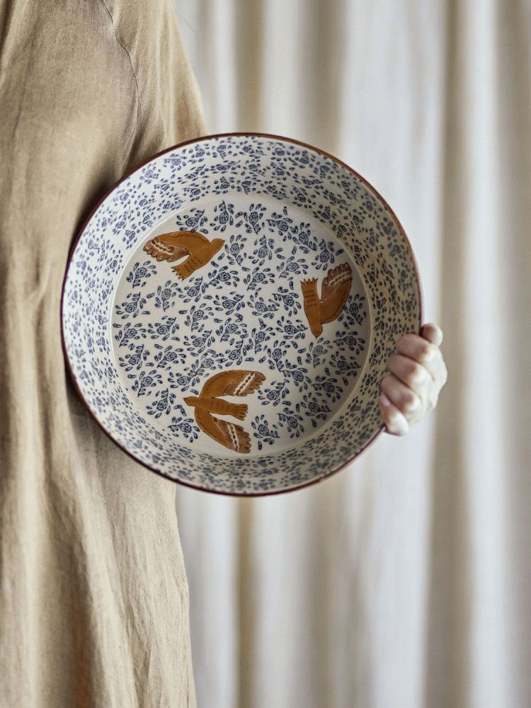 Das Besondere an dieser Schale ist die liebevolle Handmalerei, die jedes Exemplar zu einem Unikat macht. Keine zwei Schalen gleichen sich vollständig, denn die natürlichen Variationen in Muster und Farbintensität sind ein bewusster Teil des Designs und unterstreichen die handwerkliche Qualität. Die Vogelmotive zieren sowohl die Innen- als auch die Außenseite der Schale und schaffen durch ihre kontrastreichen Details in sanften und tiefen Blautönen einen lebendigen, harmonischen Gesamteindruck.