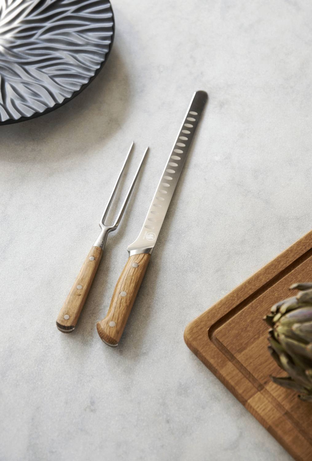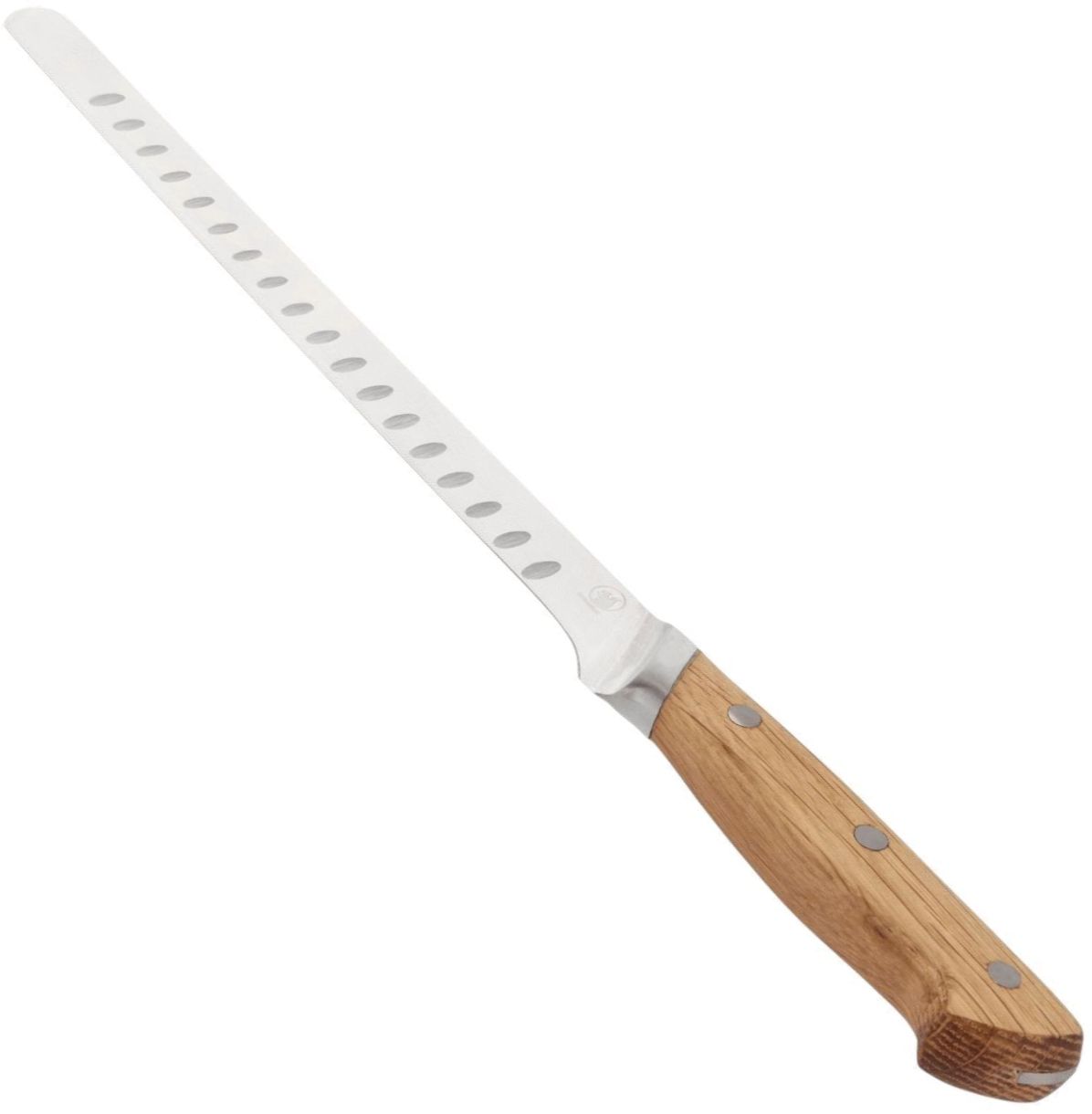 Die außergewöhnliche Qualität spürst du sofort in der Hand, wo der ergonomische Griff aus geöltem Eichenholz angenehm und sicher liegt. Der Griff ist aus einem einzigen Holzstück gefertigt, was nicht nur ästhetische Einheitlichkeit schafft, sondern auch Haltbarkeit und Balance gewährleistet. Mit der Zeit entwickelt das Holz eine wunderschöne Patina, die die Geschichte der vielen Mahlzeiten erzählt, bei deren Zubereitung das Messer mitgewirkt hat.