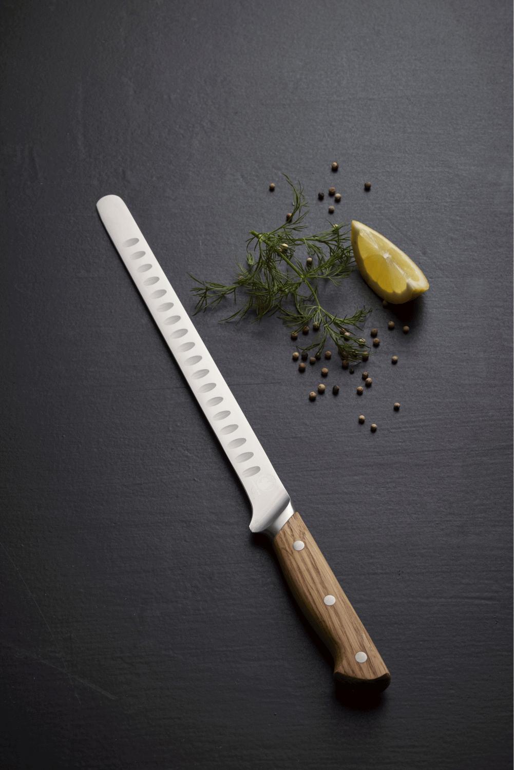 Mit diesem speziell entwickelten Lachsmesser von Morsø verwandelst du das Filetieren und präzise Schneiden von Lachs und anderen Fischen in ein wahres Vergnügen. Das flexible Klingenblad wurde sorgfältig geformt, um dir vollständige Kontrolle zu geben, wenn du perfekte, dünne Scheiben für Sushi, Sashimi oder andere delikate Fischgerichte schneidest.Die außergewöhnliche Qualität spürst du sofort in der Hand, wo der ergonomische Griff aus geöltem Eichenholz angenehm und sicher liegt. Der Griff ist aus einem einzigen Holzstück gefertigt, was nicht nur ästhetische Einheitlichkeit schafft, sondern auch Haltbarkeit und Balance gewährleistet. Mit der Zeit entwickelt das Holz eine wunderschöne Patina, die die Geschichte der vielen Mahlzeiten erzählt, bei deren Zubereitung das Messer mitgewirkt hat.