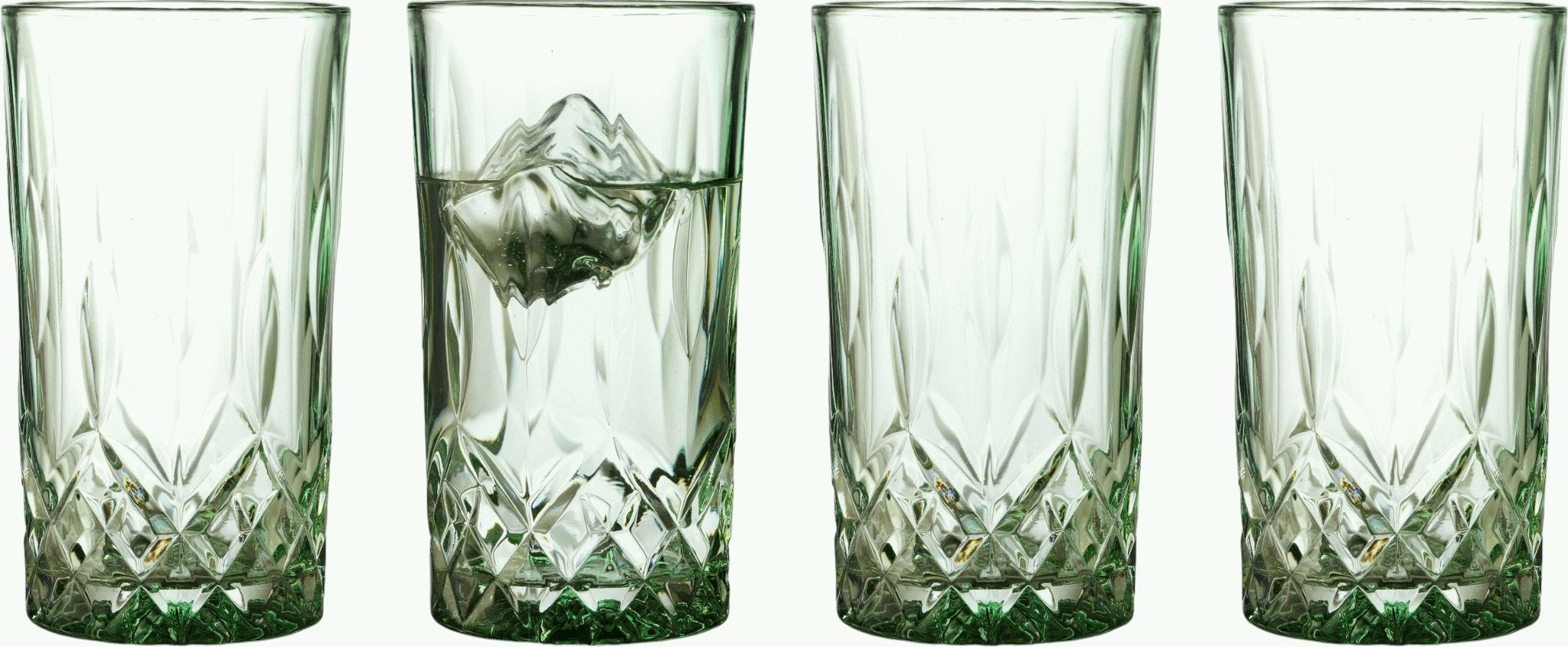 Die durchgefärbte grüne Glasstruktur mit Facetten erzeugt ein faszinierendes Lichtspiel, das nicht nur das schöne Design der Gläser hervorhebt, sondern auch das servierte Getränk optimal zur Geltung bringt. Jedes der vier Highballgläser verfügt über eine großzügige Kapazität von 38 cl, wodurch sie ideal für alles von erfrischendem Wasser und Saft bis hin zu sommerlichen Cocktails und Longdrinks sind.