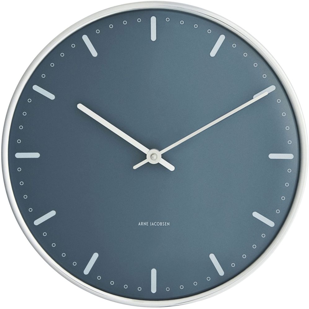 Mit der City Hall Wanduhr von Arne Jacobsen holst du dir ein echoes Meisterwerk funktionaler Gestaltung in dein Zuhause, das nun in einer modernen blauen Farbvariante präsentiert wird. Ursprünglich 1956 für das Rathaus von Rødovre entworfen, war diese ikonische Uhr Teil von Jacobsens Gesamtkonzept für das Gebäude und verkörpert skandinavische Designphilosophie in ihrer reinsten Form – eine Uhr, die die Zeit ohne störende Elemente anzeigt.Diese exklusive Ausgabe vereint das klassische City Hall-Design mit einem modernen blauen Zifferblatt, das einen frischen und zugleich zeitgemäßen Ausdruck schafft. Das Gehäuse, die Zeiger und die Stundenmarkierungen erscheinen in glänzendem Silber-Look, der dem zeitlosen Design eine exklusive Dimension verleiht. Mit einem Durchmesser von 29 cm erhält die Uhr eine markante Präsenz an deiner Wand, wo sie nahezu wie eine Skulptur im Raum schwebt.