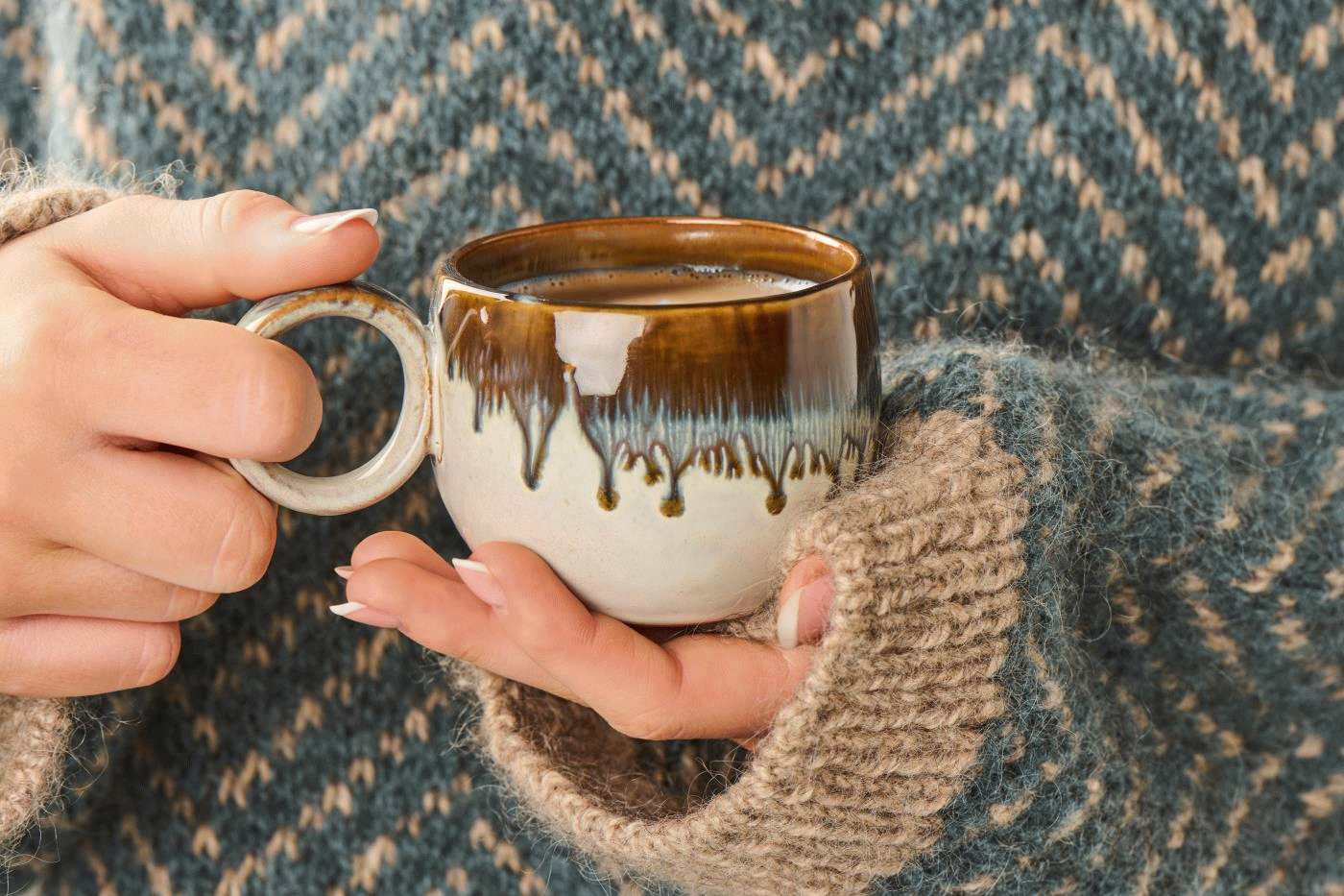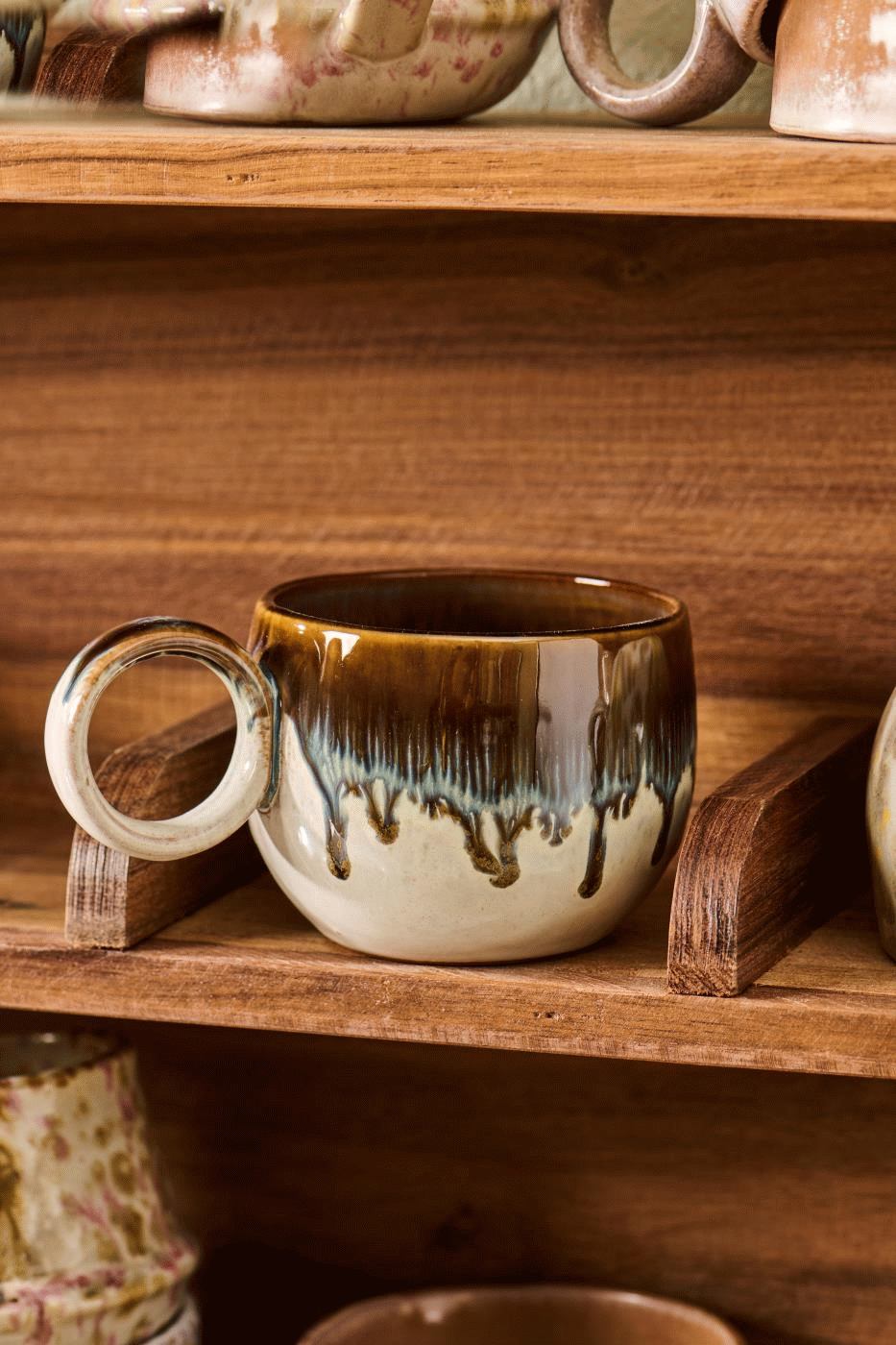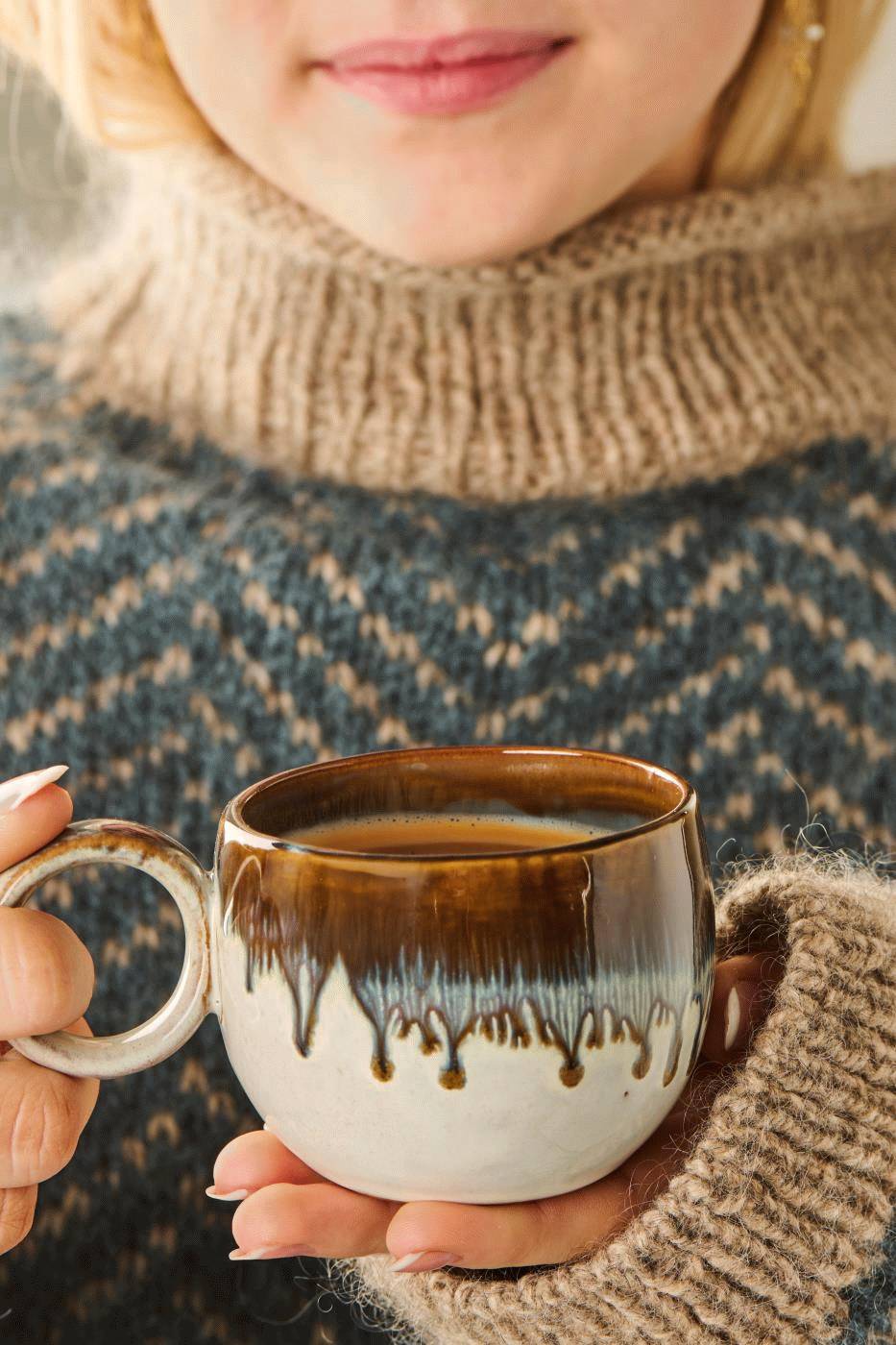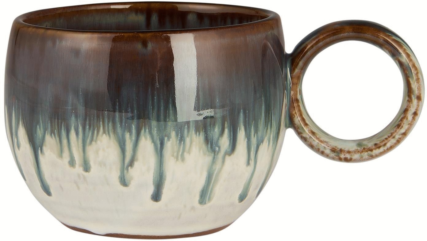 Die klassische abgerundete Form kombiniert mit dem praktischen Henkel macht diesen 12 cl Becher perfekt für deinen täglichen Morgenkaffee oder die gemütliche Nachmittagspause. Das hochwertige Steinzeugmaterial gewährleistet optimale Wärmeisolierung und Langlebigkeit, während die erdige Farbpalette mit blauen Akzenten natürlich in jede Küche oder jeden Essbereich passt.