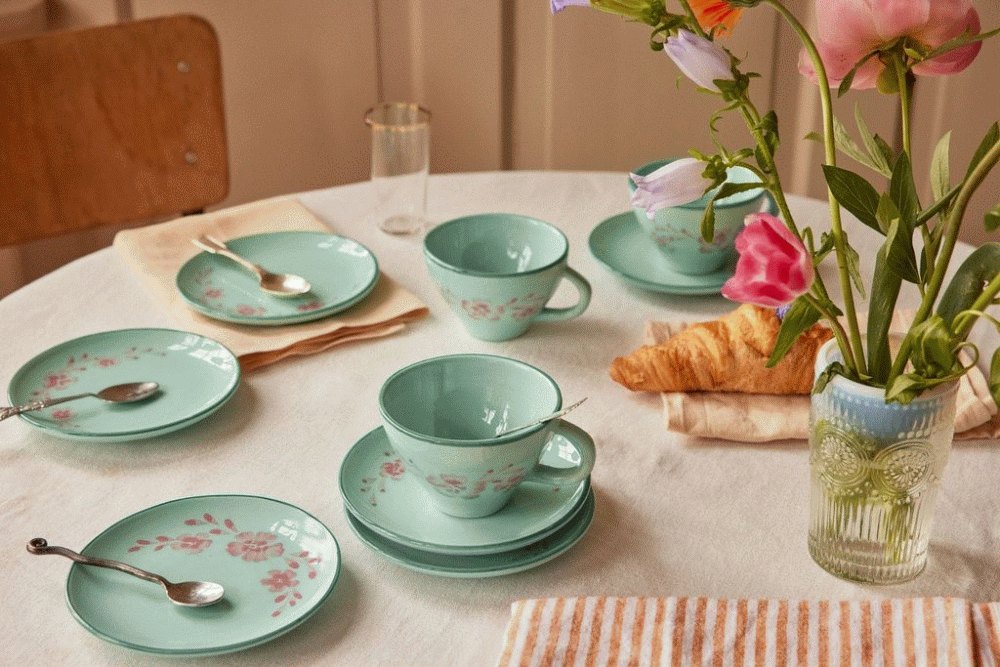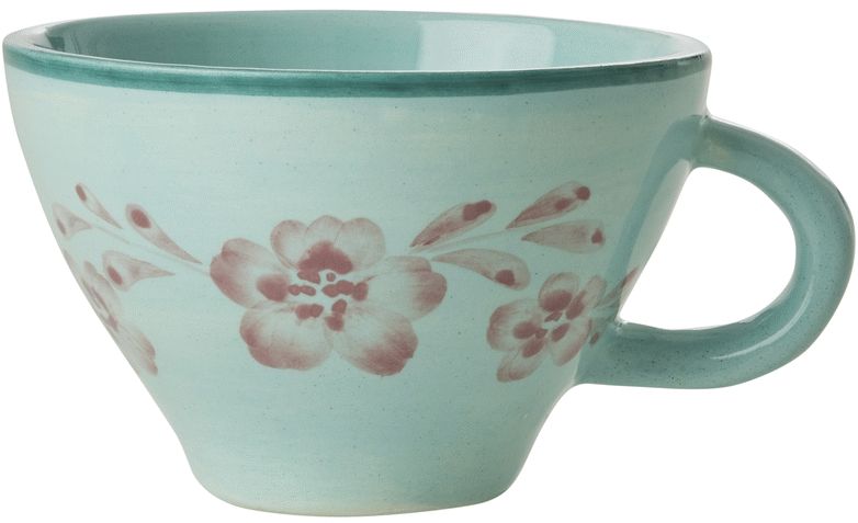 Jeder einzelne Becher wird von talentierten Handwerkern in Portugal sorgfältig von Hand bemalt, wodurch kleine Variationen und Spuren der handwerklichen Arbeit natürlich sichtbar werden. Diese einzigartigen Charakteristika sind keineswegs Fehler, sondern vielmehr ein Beweis für das authentische Handwerk, das jeden Becher zu einem ganz besonderen Unikat macht. Die zarten rosa Blütendetails auf dem mintfarbenen Hintergrund kreieren eine harmonische und zeitlose Ästhetik, die perfekt in das skandinavische Designuniversum passt.
