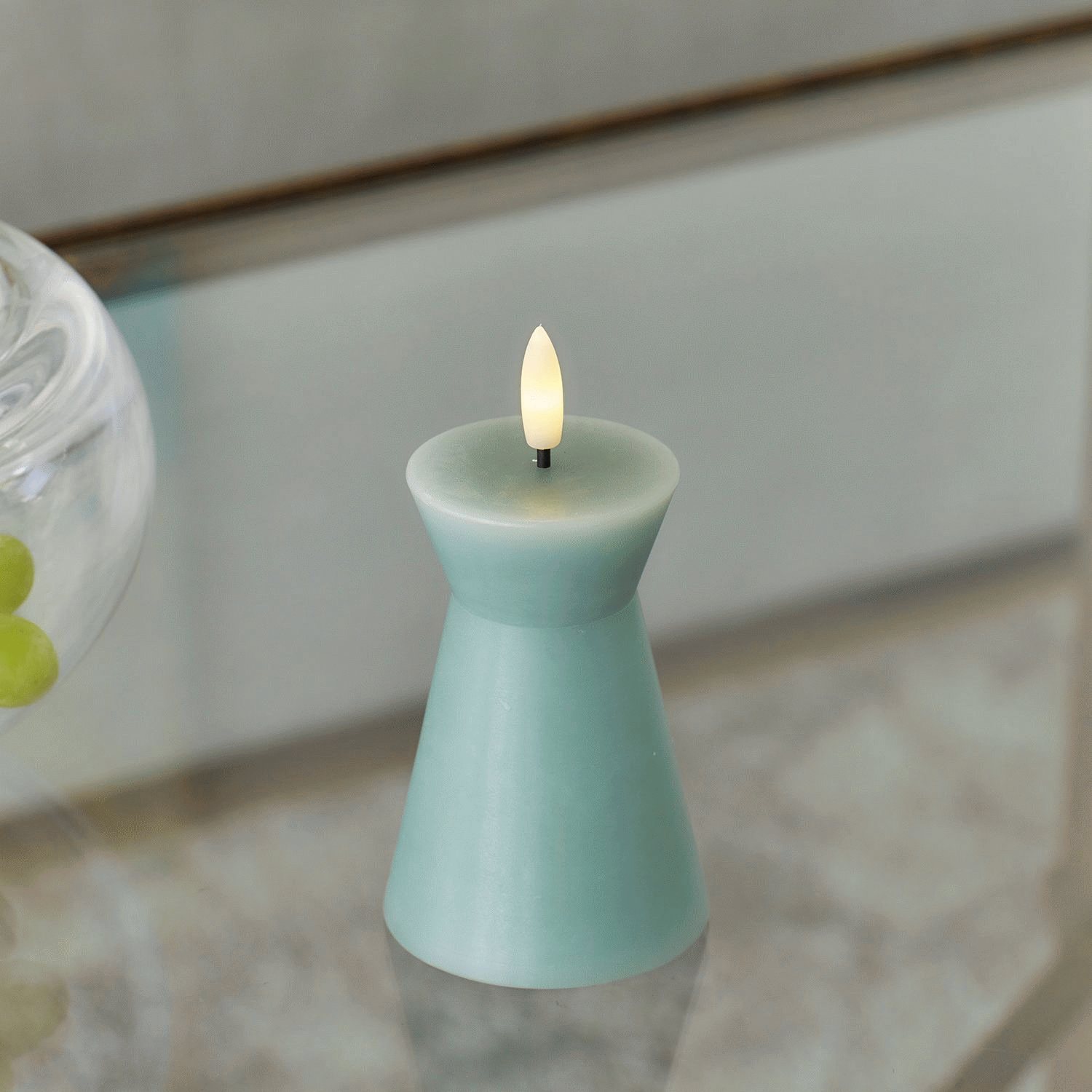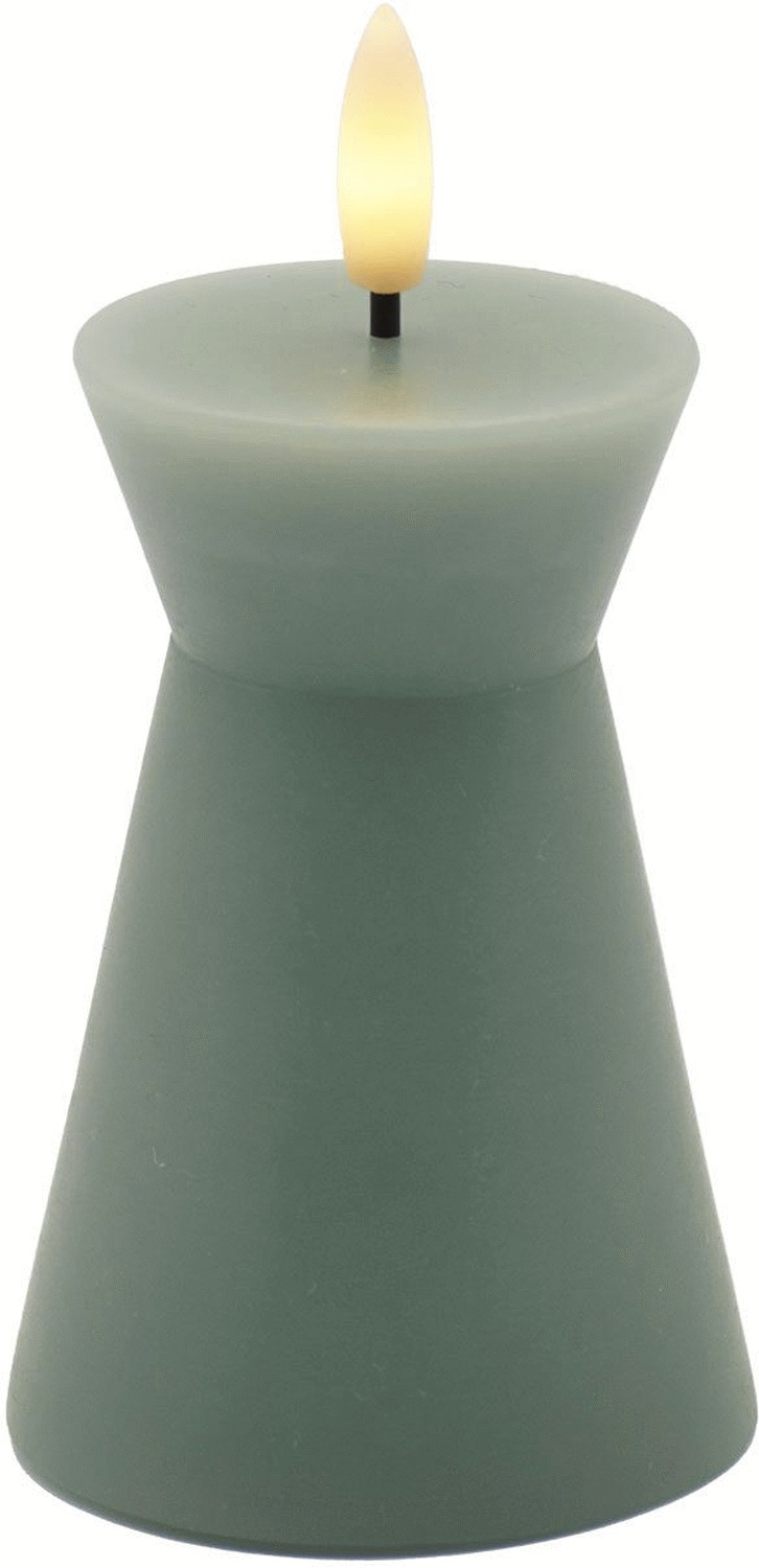 Die Kegelform verleiht diesem Leuchtmittel einen skulpturalen Charakter, der sowohl eingeschaltet als auch ausgeschaltet als dekoratives Element überzeugt. Gefertigt aus echtem Stearin mit matter Oberflächenveredelung, wirkt die Kerze authentisch und exklusiv – kaum zu unterscheiden von herkömmlichen Wachskerzen. Die sanfte sandgrüne Nuance fügt sich harmonisch in skandinavische Farbpaletten ein und passt hervorragend zu natürlichen Materialien wie Holz, Leinen oder Keramik.