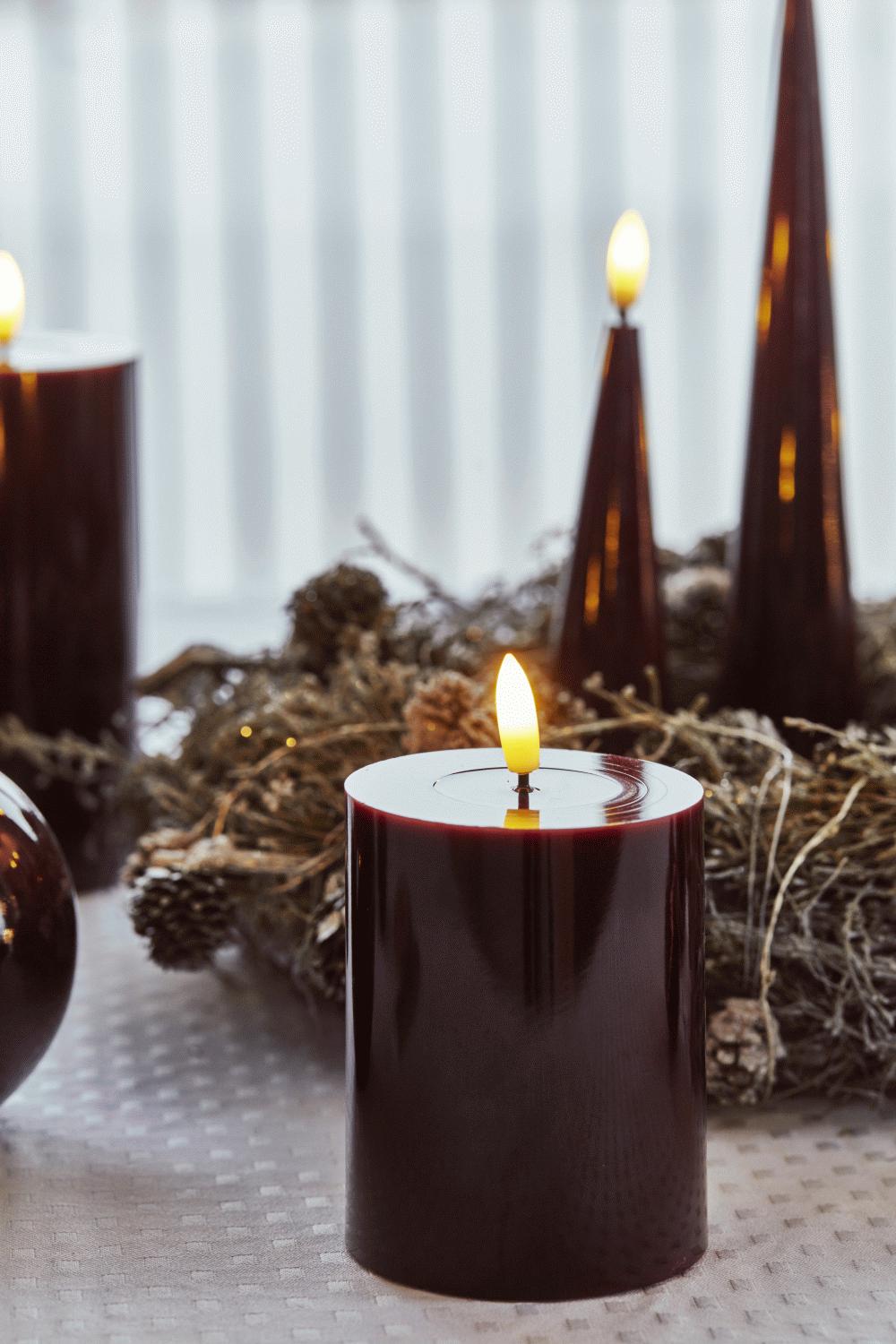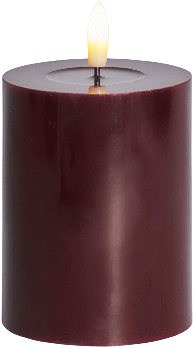 Die lackierte Oberfläche in der warmen Bordeaux-Nuance verleiht dieser LED-Kerze einen raffinierten Charakter und fügt sich harmonisch in jede Einrichtung ein. Besonders beeindruckend ist die authentische Flammenimitation: Sie sitzt auf einem schwarzen Docht, genau wie bei klassischen Kerzen, und das sanfte Auf- und Abglühen der LED sorgt für eine perfekte Stearinkerzen-Atmosphäre.