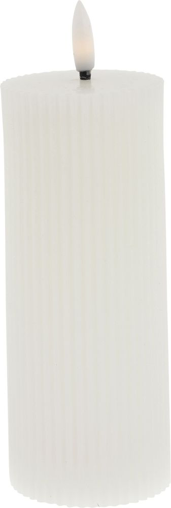 Die charakteristische geriffelte Oberfläche verleiht der Kerze einen modernen und stilvollen Ausdruck, der sich harmonisch in sowohl klassische als auch zeitgenössische Einrichtungsstile einfügt. In strahlendem Weiß schafft sie eine reine und zeitlose Ästhetik, die sich wunderbar mit anderen Farben und Größen aus der Lillia-Serie kombinieren lässt.
