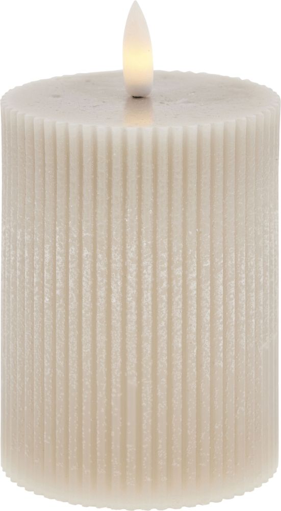 Das elegante Design aus echtem Paraffinwachs überzeugt durch seine geriffelte Oberfläche, die dem Licht einen zeitgemäßen und stilvollen Charakter verleiht. Die realistische Flammeneffekt-LED erzeugt denselben warmen, atmosphärischen Schein wie eine echte Kerze und passt sowohl zu klassischen als auch zu modernen Einrichtungsstilen. Mit ihren kompakten Abmessungen von Ø7,5xH10 cm setzt diese LED-Kerze perfekte Akzente auf dem Esstisch, in der Fensterbank oder als Teil eines größeren Lichtarrangements.