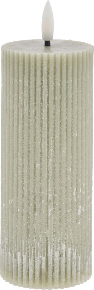 Die charakteristische gerippte Oberfläche verleiht der Stumpenkerze ein modernes und stilvolles Aussehen, während die kompakte Größe sie perfekt für Fensterbänke, Esstische und Regale macht. Der staubige grüne Farbton bringt eine ruhige und natürliche Stimmung in den Raum und harmoniert wunderbar mit anderen Farben in deiner Einrichtung.