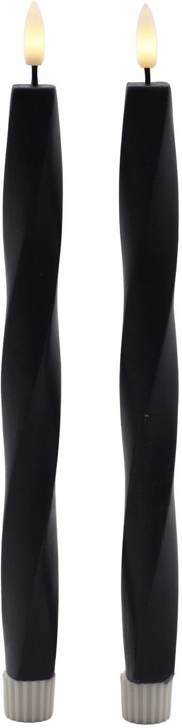 Diese skulpturalen LED-Kerzen aus der Sirius Sille Nordic Sculpture-Serie vereinen künstlerisches Design mit funktionaler Beleuchtung und bringen skandinavische Eleganz in dein Zuhause. Das charakteristische Twist-Design und die matte Oberfläche verleihen jedem Raum einen raffinierten Ausdruck, bei dem moderne Ästhetik auf klassische Gemütlichkeit trifft. Jede Kerze ist aus echtem Wachs gefertigt, was ihr eine authentische Textur und einen exklusiven Look verleiht, der an traditionelle Kerzen erinnert. Das matte schwarze Finish unterstreicht die skandinavische Designsprache und macht die Kerzen zu einem eleganten Statement sowohl in minimalistischen als auch in ausdrucksstärkeren Interieurs.Die fortschrittliche 3D-Flamme erzeugt einen natürlich flackernden Effekt, der sanft auf- und abschwingt und die Bewegung einer echten Kerzenflamme nachahmt. Diese realistische Flamme schafft eine warme und einladende Atmosphäre ohne Ruß, Rauch oder Partikel, wodurch die Kerzen das ganze Jahr über ideal für den Einsatz in deinem Zuhause geeignet sind. Mit einem Durchmesser von 2,4 cm und einer Höhe von 26 cm passen diese Stabkerzen perfekt auf Kerzenständer, festliche Tische oder als dekorative Elemente auf Regale und Fensterbänke. Die schlanken Proportionen und das skulpturale Twist-Muster machen sie zu einem wunderschönen Blickfang, der sowohl eingeschaltet als auch ausgeschaltet die Blicke auf sich zieht.