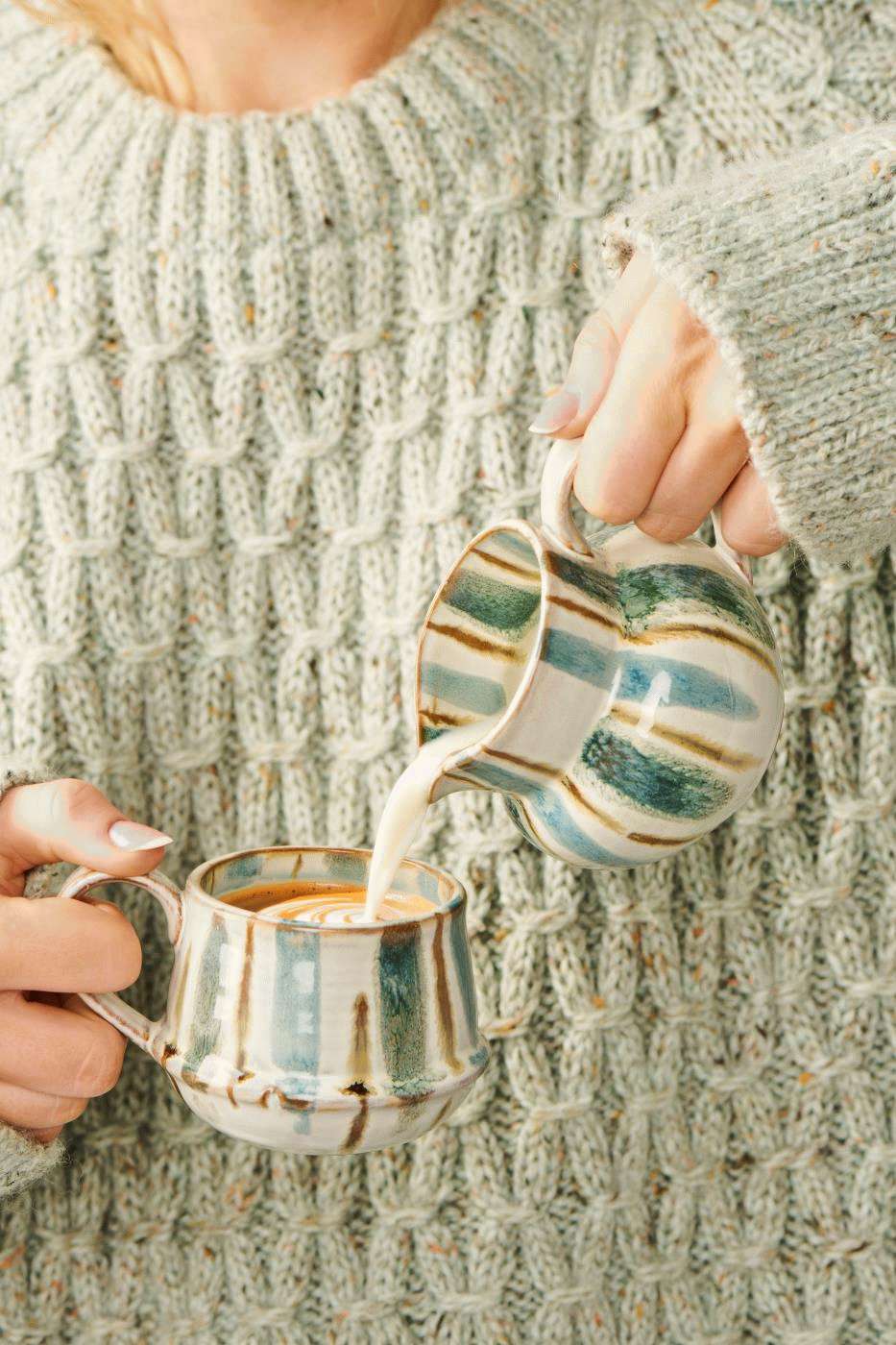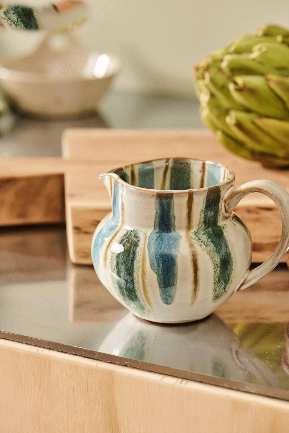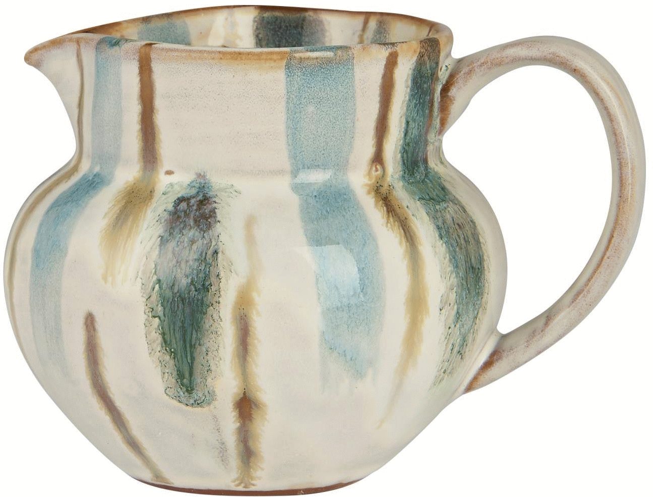 Das Besondere an dieser Kanne liegt in ihrer charakteristischen Glasur, die elegante staublaue Streifen mit feinen braunen Linien kombiniert und dadurch einen handgemalten Ausdruck schafft, der jede Kanne zu einem Unikat macht. Der leicht markierte Ausguss sorgt für präzises Gießen, während die kompakte Größe von 200 ml sie ideal für den täglichen Gebrauch und festliche Anlässe macht.