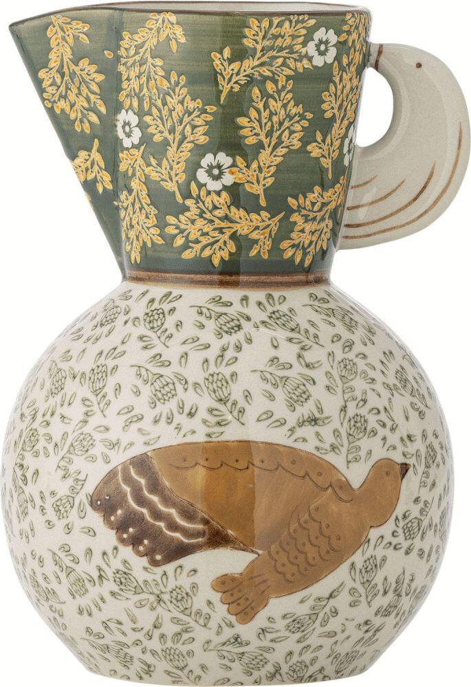 Mit dieser wunderschönen Kanne von Bloomingville holst du dir ein Stück kunstvoller Handwerkskunst direkt auf deinen Tisch. Die Hezha Kanne vereint funktionale Eleganz mit künstlerischem Ausdruck und bringt Frische sowie Persönlichkeit in dein Zuhause – ob beim Servieren erfrischender Getränke oder als dekorative Vase für deine Lieblingsblumen.Gefertigt aus robustem Steingut, überzeugt diese Kanne nicht nur durch ihre Langlebigkeit, sondern auch durch ihr angenehmes Gewicht, das sie sicher und komfortabel in der Hand liegen lässt. Die grüne Nuance bildet eine harmonische Grundlage für das handgemalte Motiv, bei dem sich Blütenzweige mit weißen Blumen elegant um die Oberfläche der Kanne winden. Ein Vogel im Flug fügt der Komposition ein lebendiges Element hinzu und erzählt eine poetische Geschichte, die sofort ins Auge fällt.