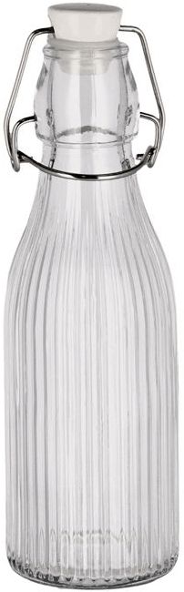 Mit dieser eleganten Glasflasche holst du dir klassisches Design und praktische Funktionalität zugleich in deine Küche. Die 250 ml Flasche mit ihrem zeitlosen, gerifften Glasdesign fügt sich nahtlos in moderne wie traditionelle Küchenumgebungen ein und eignet sich hervorragend zur Aufbewahrung von Flüssigkeiten, Ölen, Essig oder selbstgemachten Getränken. Gefertigt aus robustem Kalk-Natron-Glas, überzeugt die Flasche durch ihre klare Transparenz und Langlebigkeit. Das geriffelte Muster auf der Glasoberfläche verleiht nicht nur eine ansprechende Ästhetik, sondern sorgt auch für einen besseren Griff beim Handling. Die natürlichen Eigenschaften des Glases bewahren Geschmack und Aroma optimal, was die Flasche ideal für empfindliche Zutaten macht.Besonders hervorzuheben ist der durchdachte Patentverschluss: Ein Porzellandeckel mit praktischem Silikonring gewährleistet einen luftdichten Abschluss, während der Edelstahlbügel den Deckel sicher an Ort und Stelle hält. Diese Verschlussmechanik ist nicht nur funktional und langlebig, sondern schützt den Inhalt auch effektiv vor Luft und Feuchtigkeit. Du kannst die Flasche problemlos wiederholt öffnen und schließen, ohne dass das Material darunter leidet.