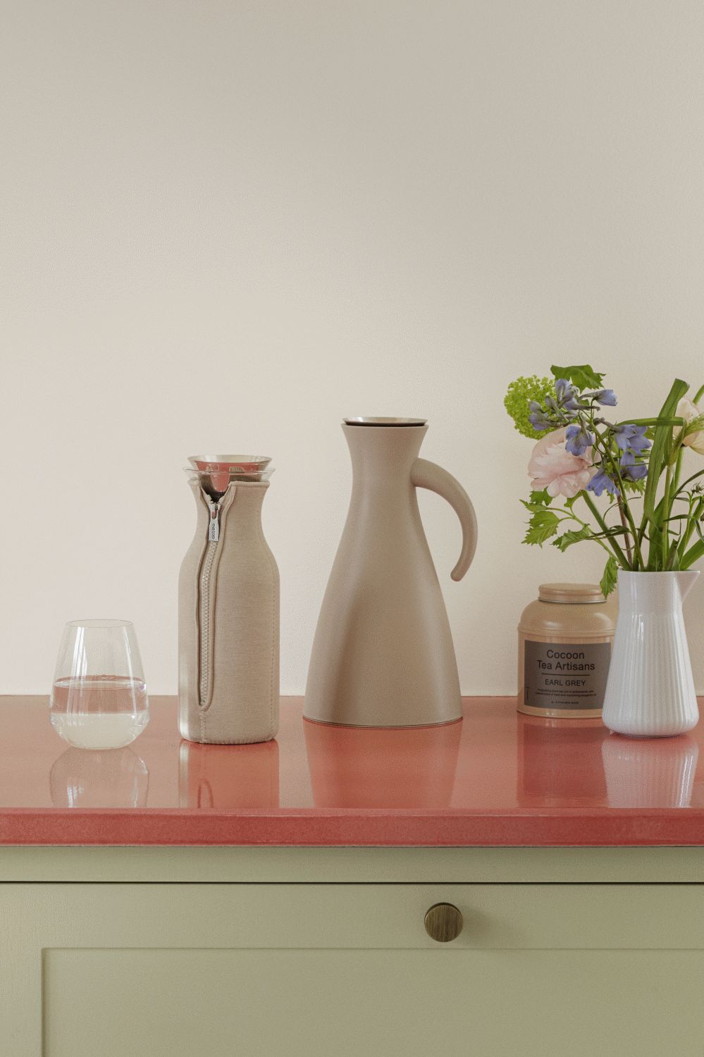 Die charakteristische Neoprenhülle mit gewebter Textilaußenseite macht diese Karaffe zu einem echten Allrounder. Sie liegt angenehm in der Hand, hilft dabei, die Temperatur deiner Getränke zu bewahren, und absorbiert Kondenswasser – so entstehen keine lästigen Wasserflecken auf deinem Küchentisch. Ob eiskaltes Wasser im Sommer oder warme Getränke im Winter, diese vielseitige Karaffe meistert beides mit Bravour.