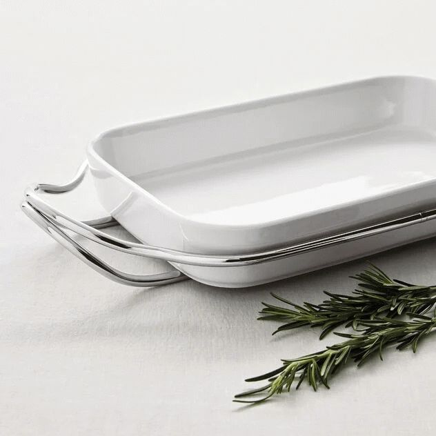 Dieses elegante Servierset vereint italienische Designtradition mit durchdachter Funktionalität für dein modernes Zuhause. Die New Living Serie von Sambonet präsentiert eine rechteckige Platte aus weißem Porzellan, die sicher in einem Halter aus glänzendem Edelstahl ruht. Das Set ist so konzipiert, dass es eine raffinierte Präsentation ermöglicht, bei der das reine weiße Porzellan einen wunderschönen Kontrast zum spiegelglatten Stahl bildet.Der Halter besteht aus rostfreiem Edelstahl mit einem spiegelpolierten Finish, das durch sorgfältiges Polieren mit Additiven und mechanischen Bürsten aus verschiedenen Materialien erreicht wird. Dieser Prozess glättet den Stahl und verleiht ihm einen hohen Glanz, der die Formen betont und das Design aufwertet. Die spiegelnden Oberflächen geben dem Servierset eine zusätzliche Dimension von Eleganz und machen es zu einem ästhetischen Statement auf jedem Esstisch.