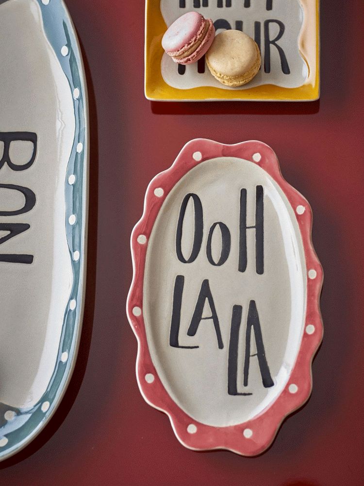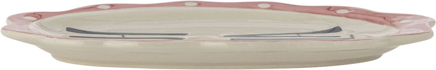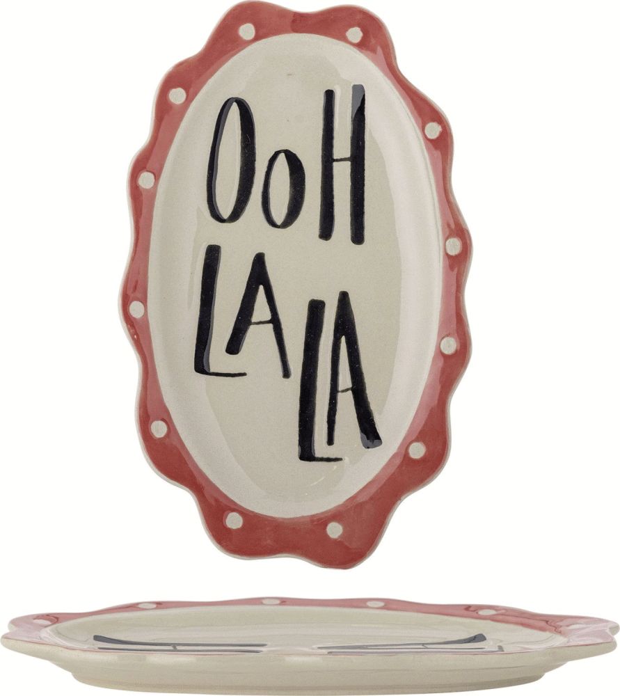 Mit diesem bezaubernden Serviertablett von Bloomingville holst du dir einen Hauch französischer Lebensfreude direkt auf deinen Tisch. Das Soline Serviertablett vereint skandinavische Handwerkskunst mit verspielter Eleganz und verwandelt jede Anrichtung in einen echten Hingucker. Die warme beige Grundfarbe wird durch zarte Rosatöne und elegante schwarze Details ergänzt, während der markante Schriftzug „Ooh La La" in der Mitte dem Ganzen eine charmante, lebensfrohe Note verleiht.Die gewellte Kante mit ihren weißen Punkten bildet einen stilvollen Rahmen für das ausdrucksstarke Muster und unterstreicht den künstlerischen Charakter dieses Tabletts. Da jedes Stück von Hand bemalt wird, ist dein Serviertablett ein echtes Unikat – kleine Variationen in Muster und Farbintensität sind nicht nur natürlich, sondern machen gerade den besonderen Reiz aus. Diese individuelle Note verleiht dem Tablett eine Authentizität, die maschinell gefertigte Produkte niemals erreichen können.