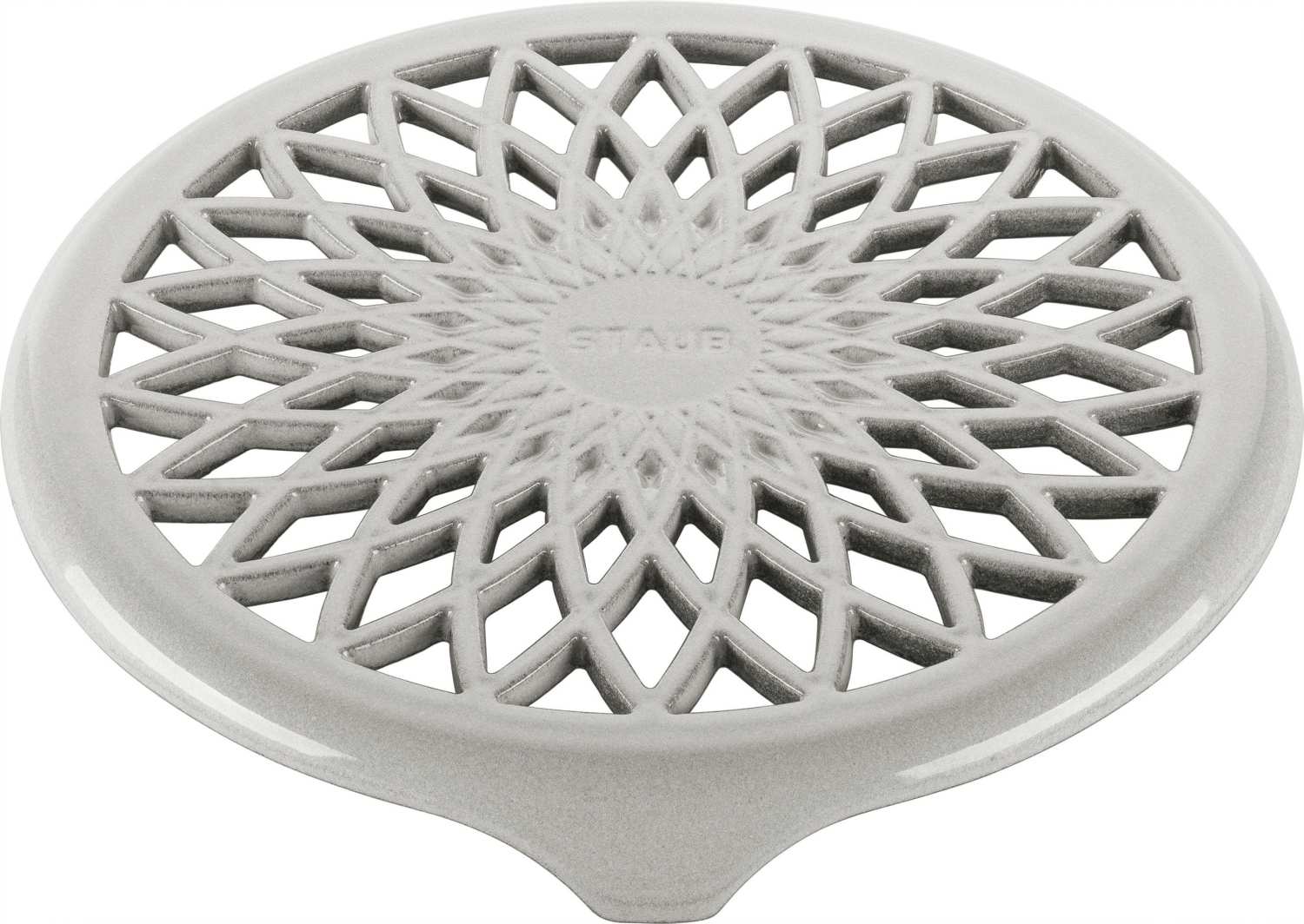 Mit diesem raffinierten Untersetzer von Staub bringst du französische Kochkunst und elegante Funktionalität direkt auf deinen Esstisch. Die edle White Truffle-Nuance verleiht diesem praktischen Küchenhelfer eine zeitlose Eleganz, die sich harmonisch in jede Kücheneinrichtung einfügt und sowohl moderne als auch klassische Tischdekorationen perfekt ergänzt.Das charakteristische Lilienmuster macht diesen Untersetzer zu einem wahren Blickfang und verwandelt ihn von einem simplen Gebrauchsgegenstand in ein dekoratives Element deiner Tischgestaltung. Die robuste Gusseisenkonstruktion gewährleistet nicht nur optimalen Schutz für deine Tischoberflächen, sondern auch eine außergewöhnliche Langlebigkeit, die jahrelange Nutzung verspricht.