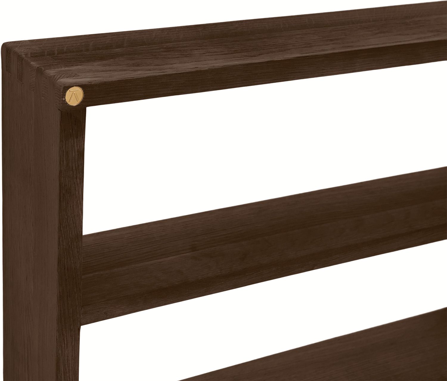 Die organischen Formen und sanften Linien des Regals schaffen eine harmonische Balance, die sich mühelos in jeden Wohnstil integrieren lässt. Gefertigt aus massiver Eiche mit einer wunderschönen geräucherten, geölten Oberfläche, betont das Regal die natürliche Struktur des Holzes und verleiht deinen Räumen eine warme, zeitlose Ausstrahlung. Die charakteristischen senkrechten Seitenwände fungieren nicht nur als markantes Designelement, sondern sorgen auch dafür, dass deine Gegenstände elegant und sicher ihren Platz finden – ob Bücher, Dekorationsobjekte oder grüne Pflanzen.