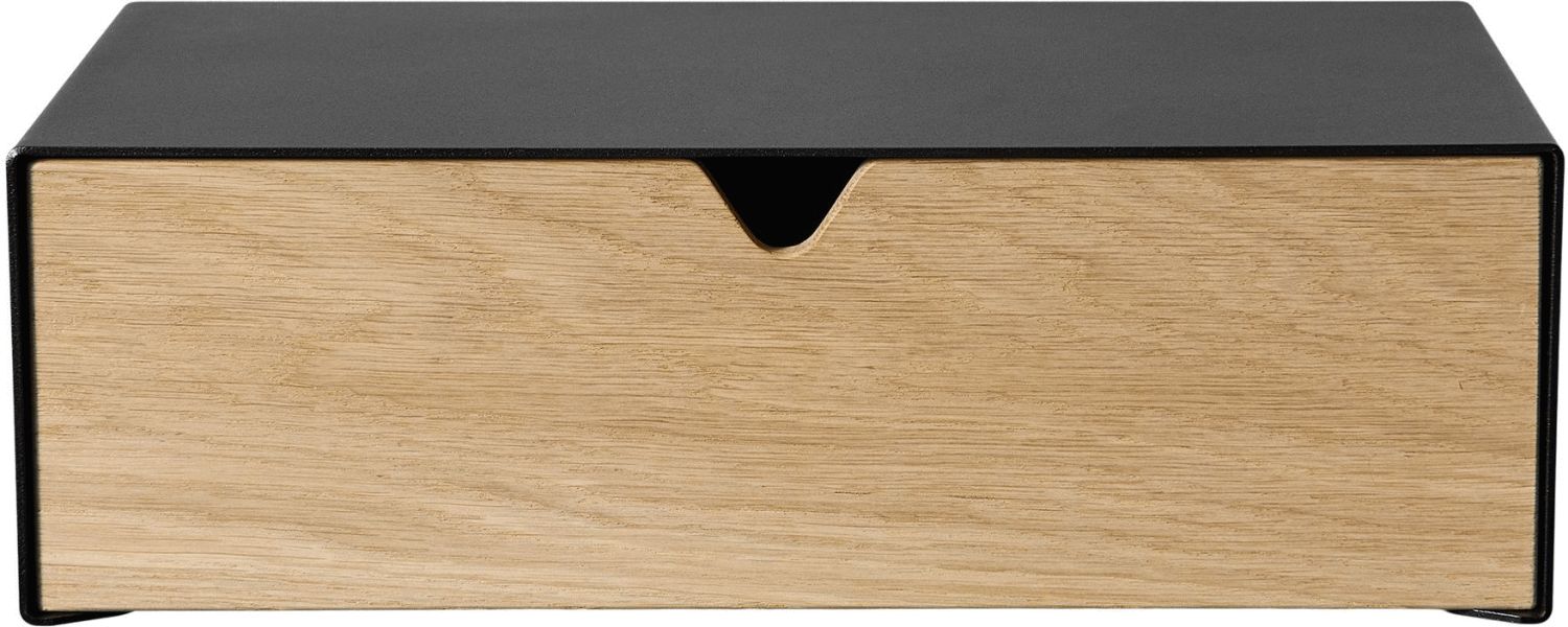 Die charakteristische Eichenschublade verleiht dem minimalistischen Metalldesign natürliche Wärme und schafft einen harmonischen Kontrast, der sowohl in moderne als auch klassische Wohneinrichtungen perfekt integriert. Diese durchdachte Materialkombination macht das Regal zu einem vielseitigen Begleiter - ob als praktische Aufbewahrungslösung im Eingangsbereich für Schlüssel, Brille und andere Alltagsgegenstände oder als eleganter Nachttisch im Schlafzimmer.