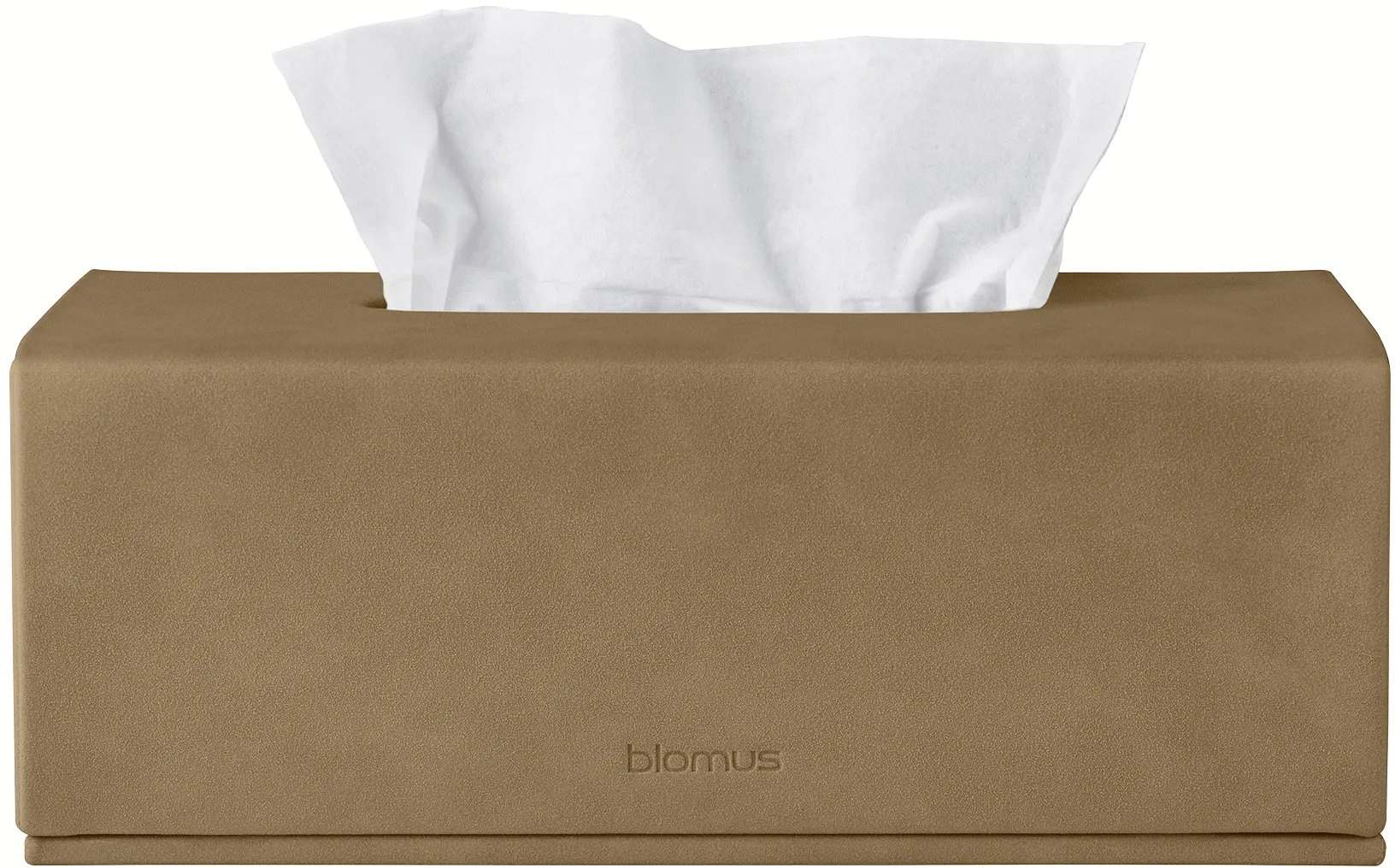 Diese stilvolle Serviettenbox aus der blomus SAHLA-Serie vereint praktische Funktionalität mit elegantem Design in der warmen Farbe Indian Tan. Die Box ist speziell dafür konzipiert, handelsübliche Taschentuch- oder Kosmetikboxen aufzunehmen und verleiht dabei deinem Zuhause einen raffinierten Touch. Die ovale Öffnung an der Oberseite verfügt über einen praktischen Schlitz, durch den du die Tücher wie gewohnt einfach herausziehen kannst.Das Besondere an dieser Serviettenbox liegt in ihrer hochwertigen Verarbeitung und dem durchdachten Design. Der Deckel lässt sich mühelos öffnen und ermöglicht dir einen bequemen Zugang zum Nachfüllen. Die robuste Konstruktion besteht aus einer stabilen Pappschachtel, die mit luxuriösem PU-Leder in Wildlederoptik bezogen ist. Dieses Material verleiht dem Produkt nicht nur eine Premium-Haptik, sondern sorgt auch für außergewöhnliche Langlebigkeit.